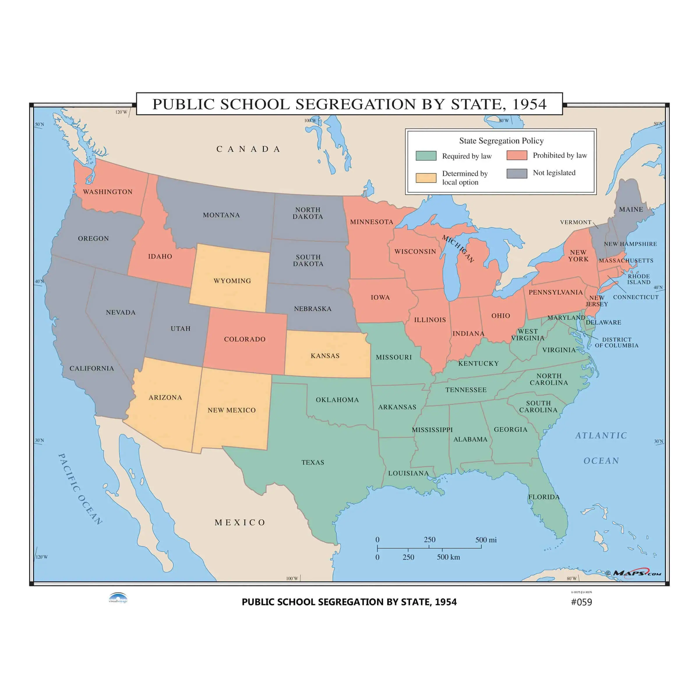 The Public School Segregation by State, 1954 wall map shows which states required segregation by law; which states prohibited it; where it was determined by local options; and where it was not legislated.