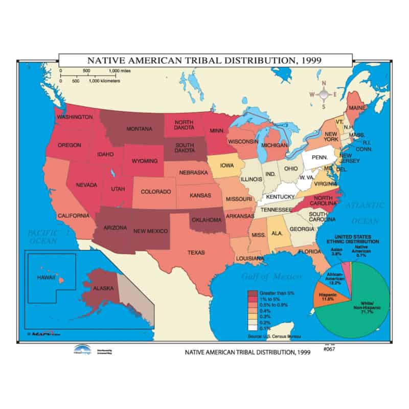 Native American Tribal Distribution, 1999 shows, by state, the percentages of Native Americans in the US. Also provides the United States ethnic distribution, by percentages of White, Hispanic, African American, Asian, and Native American, in an inset pie chart.