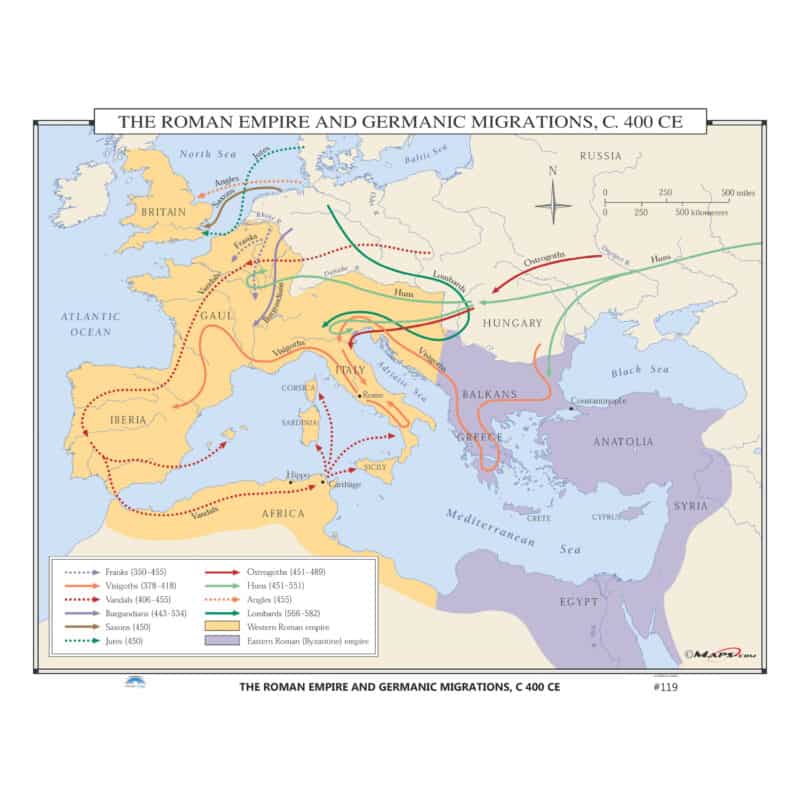 The Roman Empire & Germanic Migrations, 400 CE shows the Western and Eastern Roman Empires, and illustrates movements of the Franks, Visigoths, Jutes, and several others. Also included are the approximate time frames of the movements.Â