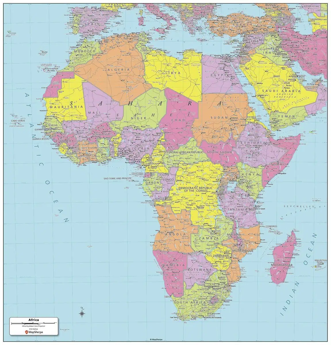 Explore the African continent with this map created specifically for MapSherpa. New and up-to-date, this Map shows the 54 countries that make up the continent. Stretching from the Mediterranean in the north to the edge of Asia, and to the Cape of Good Hope in the south, this map prominently shows; national capitals, primary cities & towns, primary water features, mountain ranges and all time zones. With multiple sizes available, this is the perfect reference map for home, office, or school use.