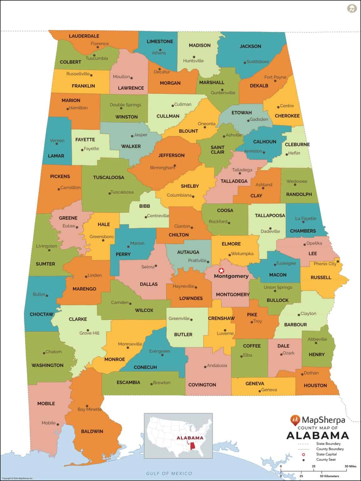 This map has been created exclusively for MapSherpa, and designed for reference or business use. Clear and clean colors & fonts matched with cartographic research makes this map of the 67 Alabama counties easily readable and useful.