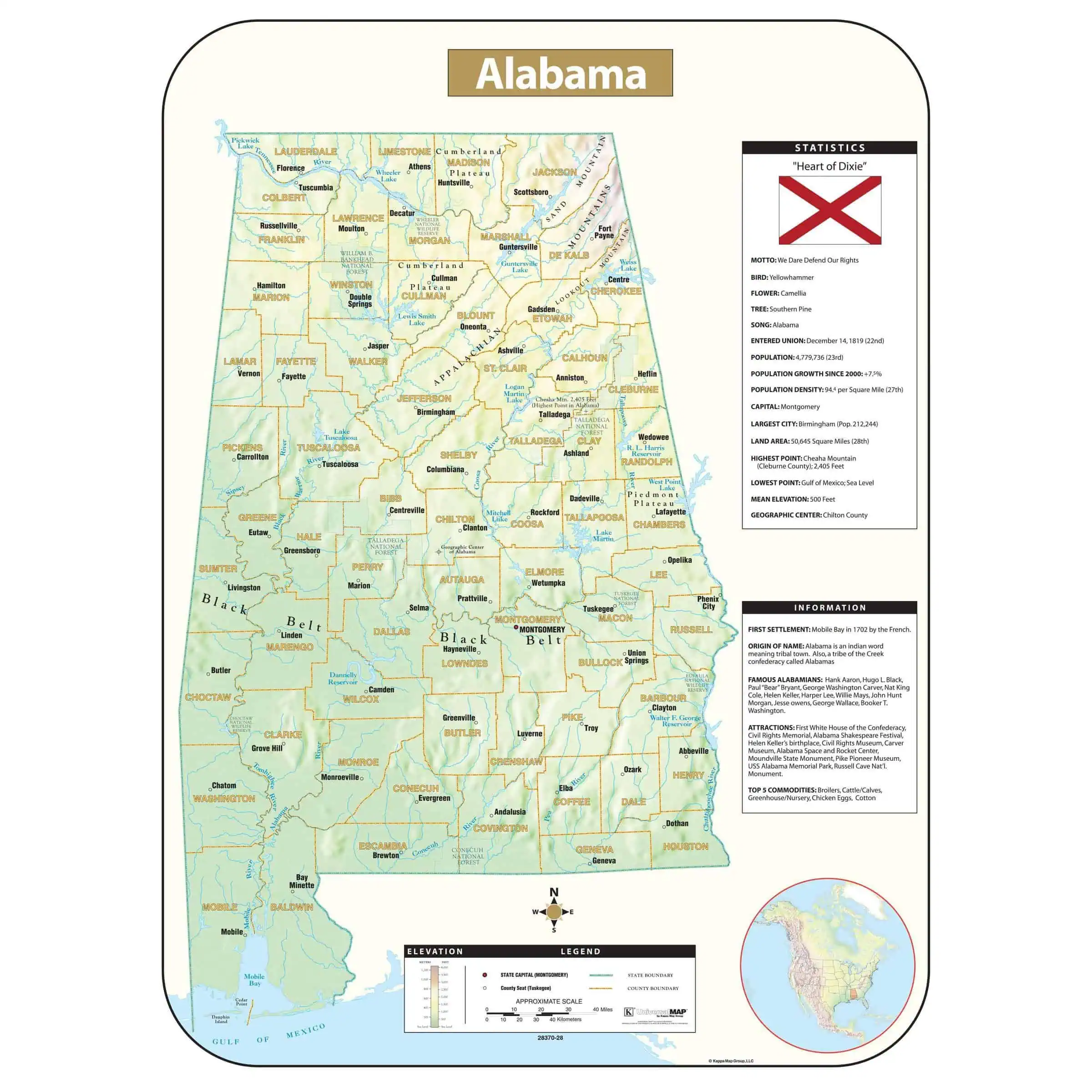 The Alabama Shaded Relief Wall Map by Kappa Map Group comes in three sizes. It includes: