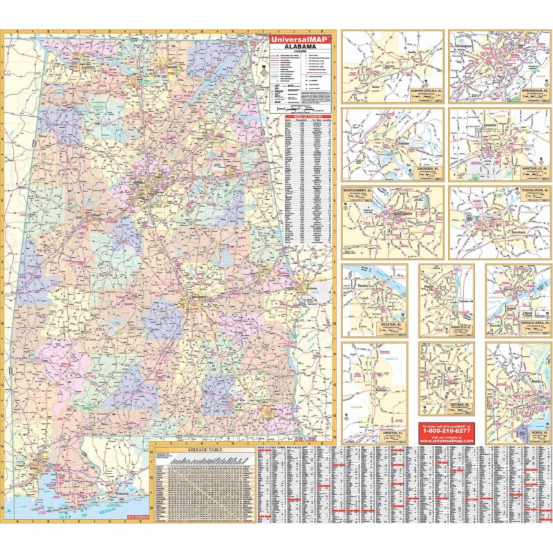 The Alabama State Wall Map by Kappa Map Group provides a comprehensive view of Alabama’s geographical features and important locations. It offers valuable details such as state and federal highways, major waterways, state universities, military installations, major airports, cities and towns, state parks, wildlife areas, exit numbers, mileage table, time zone boundaries, and points of interest. This map is a useful resource for various purposes, allowing you to explore and navigate the state of Alabama effectively.