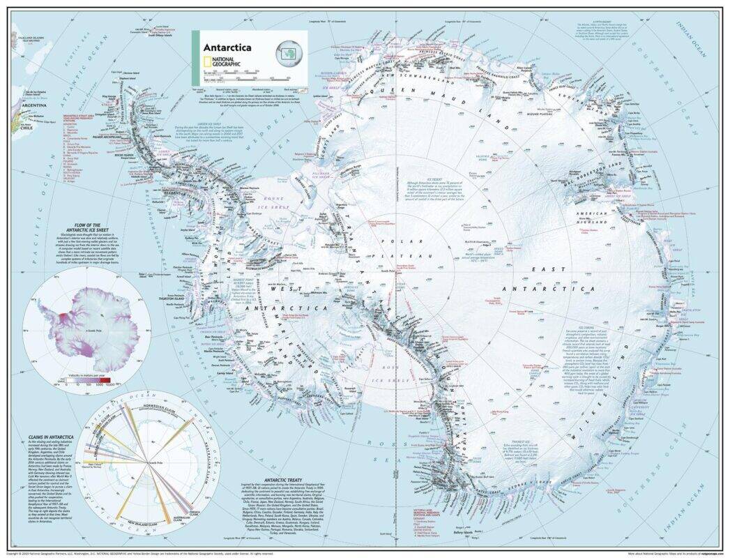 This political map of the Antarctic Ocean uses a bright, easy to read color palette featuring blue oceans and stunning shaded relief that has been featured on National Geographic wall maps for over 75 years.