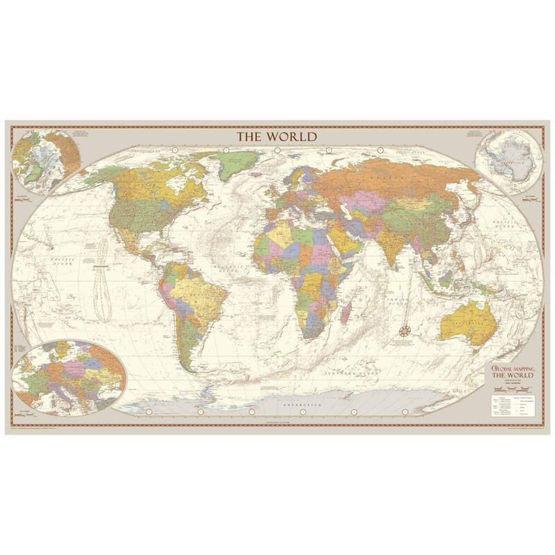 A classic design for this map from Global Mapping, the larger version won the award for Best Wall Map 2013 from the British Cartographic Society. This very attractive map features insets of the two polar regions as well as an enlargement of Central Europe. Uniquely, the map also includes explanatory text about the Tropics of Cancer and Capricorn, the Arctic and Antarctic Circles as well as an Analemma which shows which day of the year the sun is directly overhead and how sun time compares to clock time. The muted colours and hill shading give an antique feel to the map.
