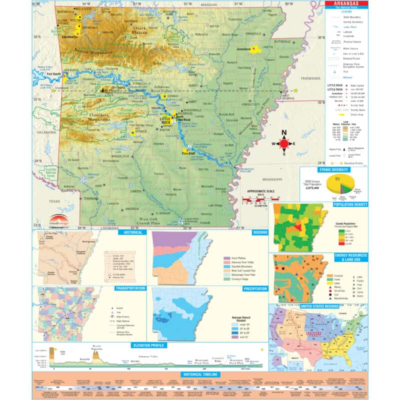 The Arkansas State Intermediate Thematic Wall Map is the perfect teaching aid for state studies and related subjects. Political/physical maps with hypsometric colorations; shows county boundaries, interstate highways, county seats, cities and towns, and state regions. Maps correlate with state standards and curriculum guidelines.