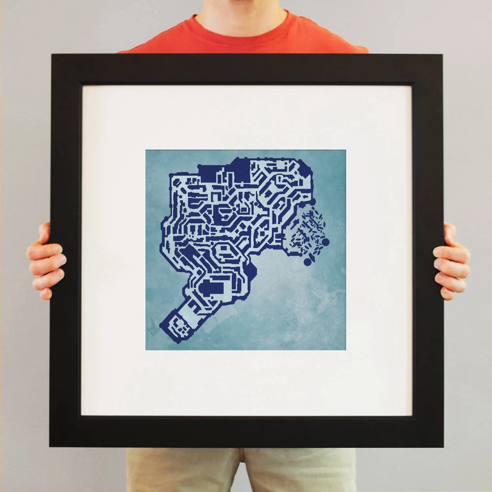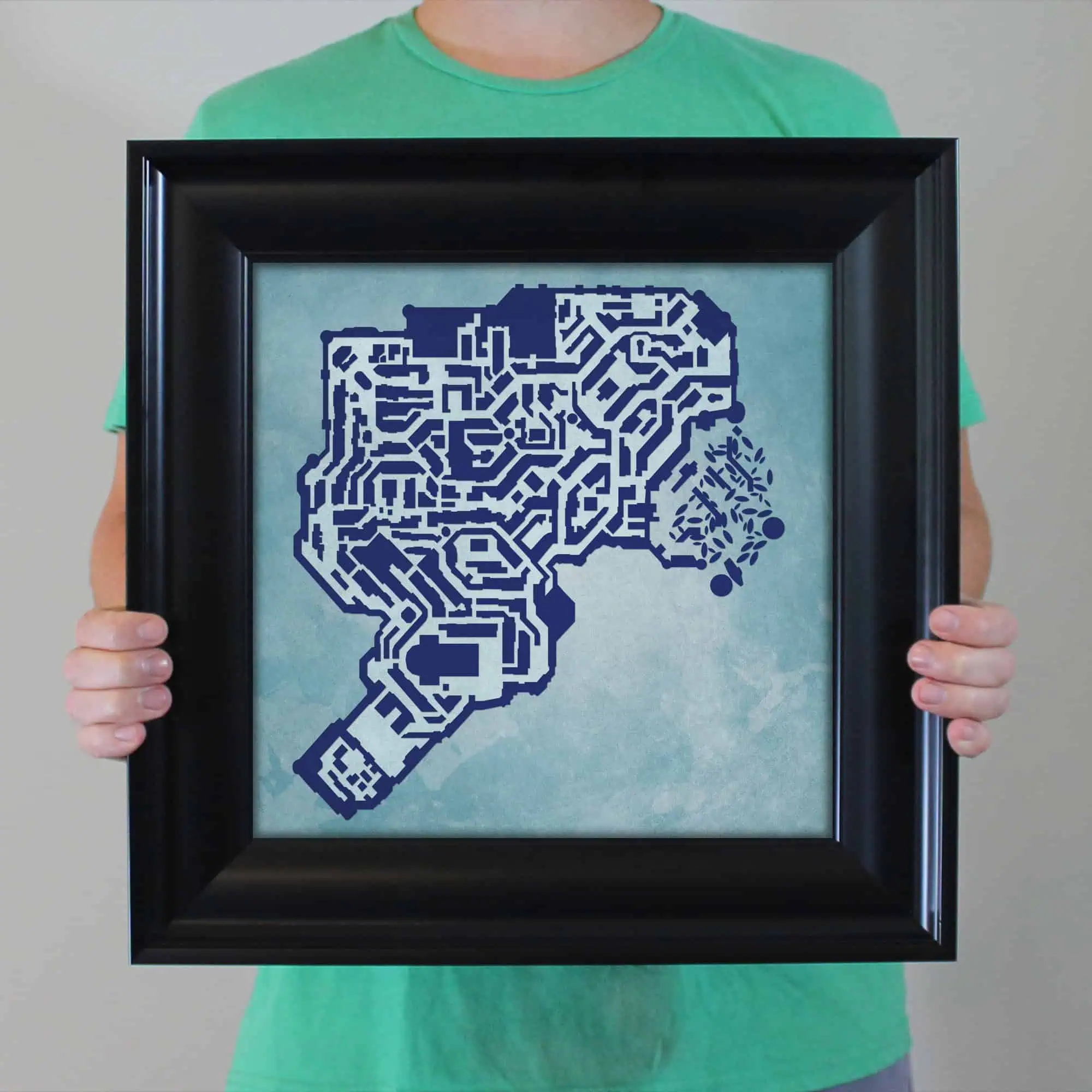 The size of this frame will vary depending on the size of the map you created. Frames are 16.5″ x 16.5″ for 12″ x 12″ prints and frames are 16.5″ x 20.5″ for 12″ x 16″ maps. Our frames have a black 2.75” wide heavy polystyrene molding. We choose to mount the prints without a glass/acrylic overlay, which shows off the unique properties of our paper stock when it hits the light. The back of the frame is sealed with a dust cover for added protection. Industrial silver hanging hardware is fixed to the back of the frame so it’s ready to hang on your wall.