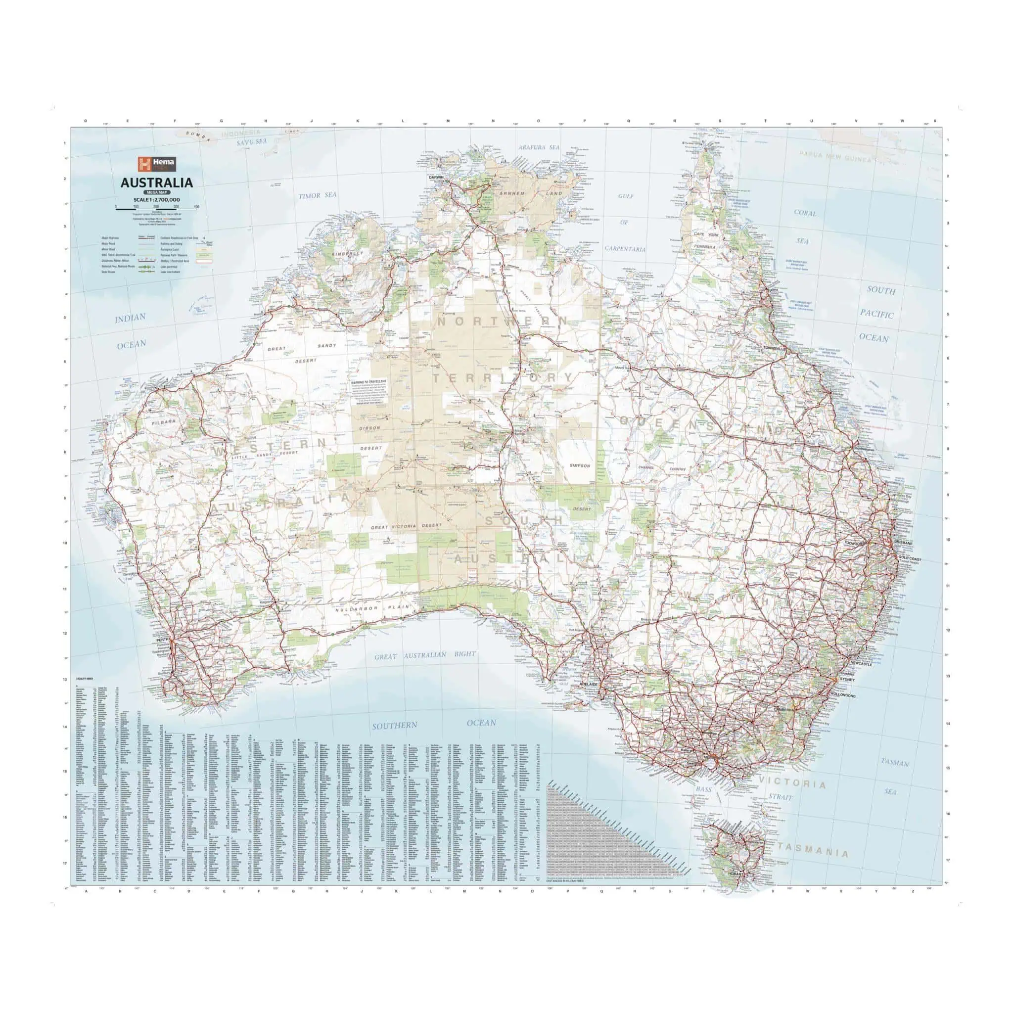 A giant comprehensive road map of Australia that differentiates between major, minor, sealed, and unsealed roads to make an intricately relevant account of Australia for travelers and tourers.Â