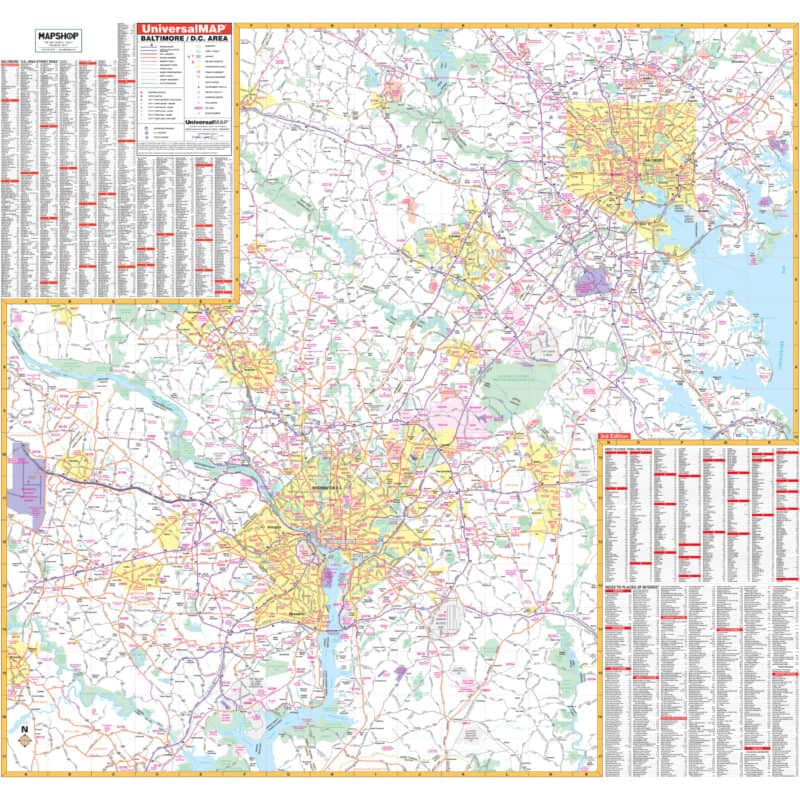 Map Shop carries this detailed wall map of the Baltimore-Washington metropolitan area, produced by Kappa Map Group. It displays the complete road network across both metro regions, from interstates and federal highways down to county roads and neighborhood streets. A street index is printed on the map face, so there’s no need for a separate reference guide.