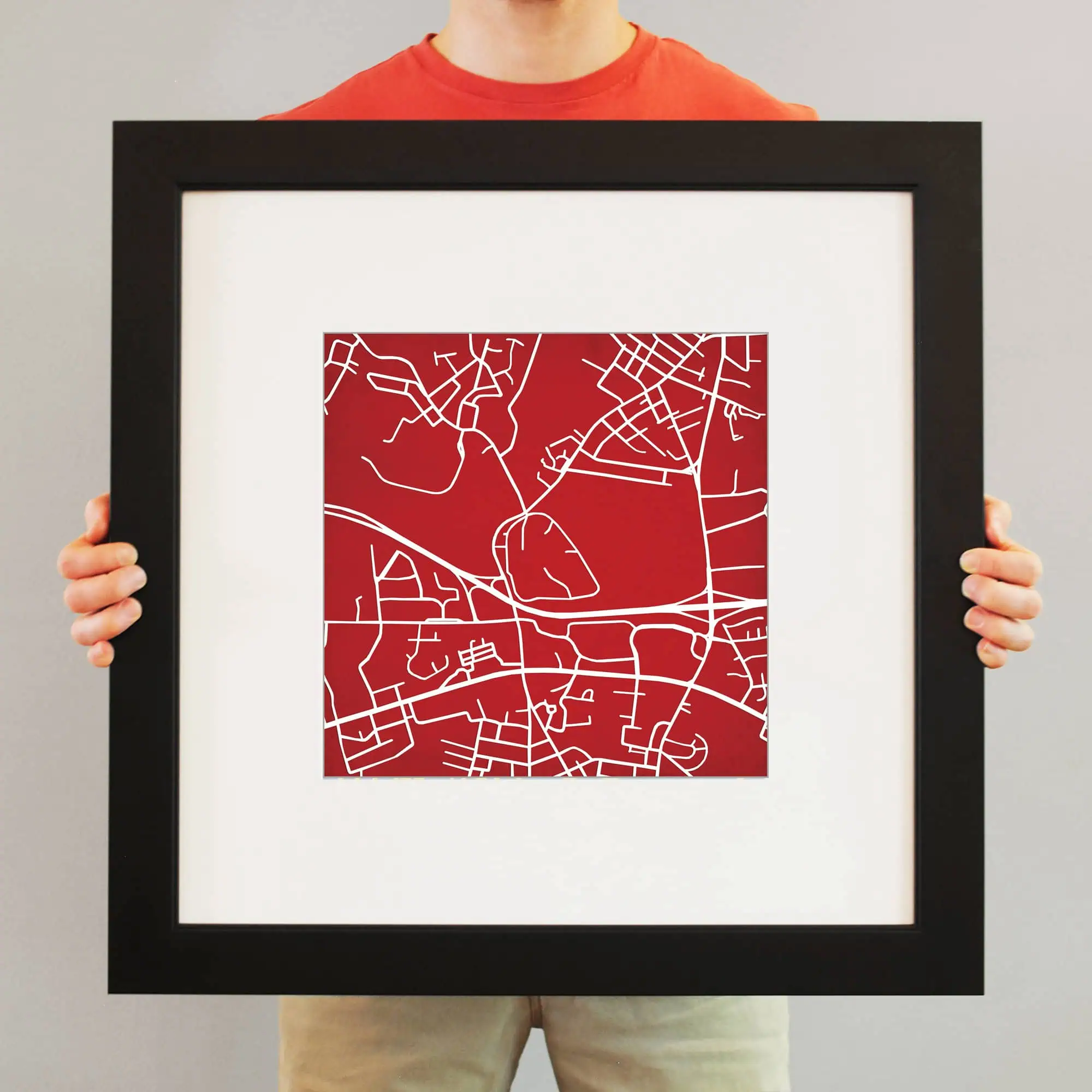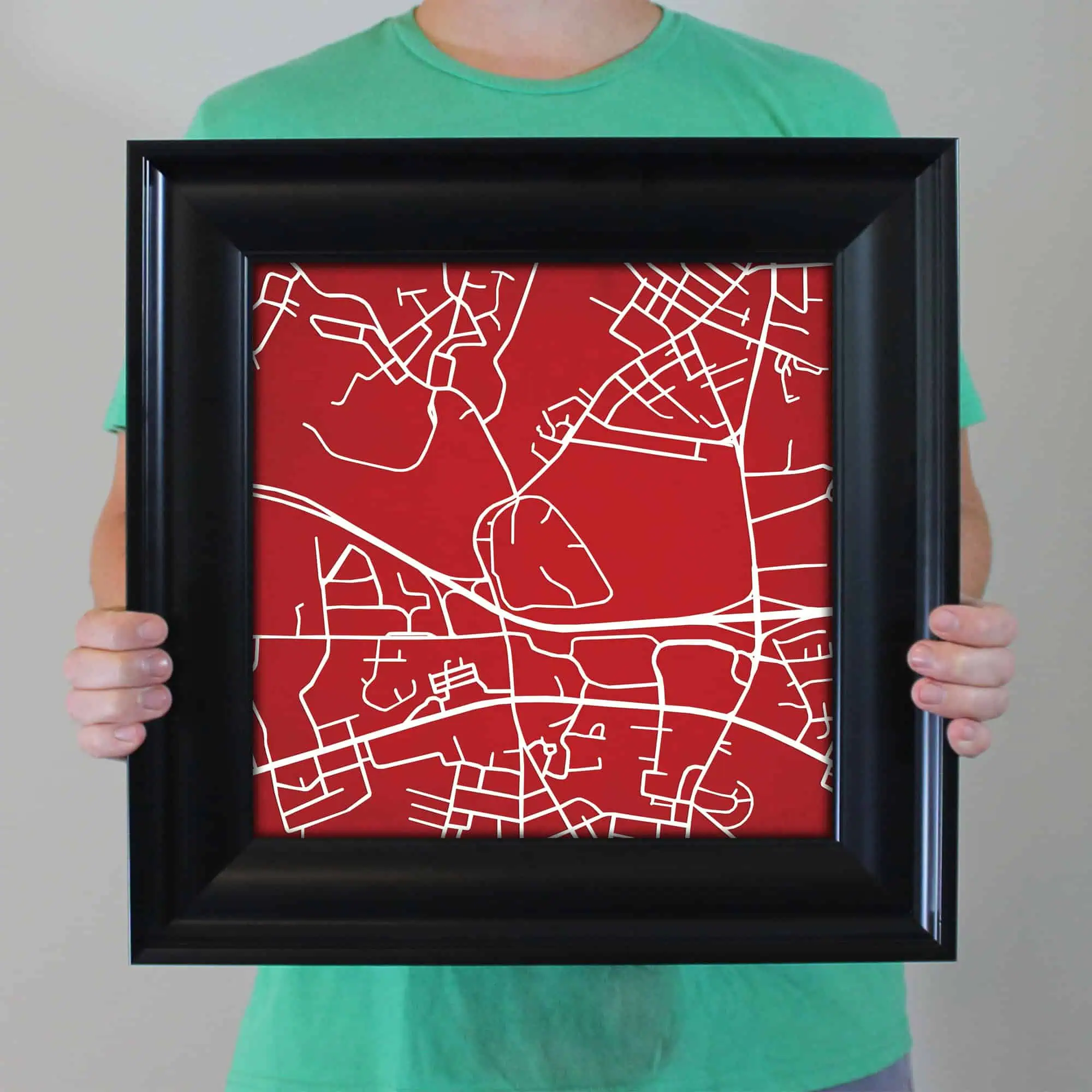 The size of this frame will vary depending on the size of the map you created. Frames are 23″ x 23″ for 12″ x 12″ prints and frames are 15.75″ x 19.75″ for 12″ x 16″ maps. Both frames have a black 1.75” wide genuine-wood molding. The print is enhanced with a soft white acid-free mat, which is bevel cut and placed on top of the print. The print and matt are protected by a premium crystal-clear acrylic overlay. The back of the frame is sealed with a dust cover for added protection. Industrial silver hanging hardware is bolted to the back of the frame so it’s ready to hang on your wall.