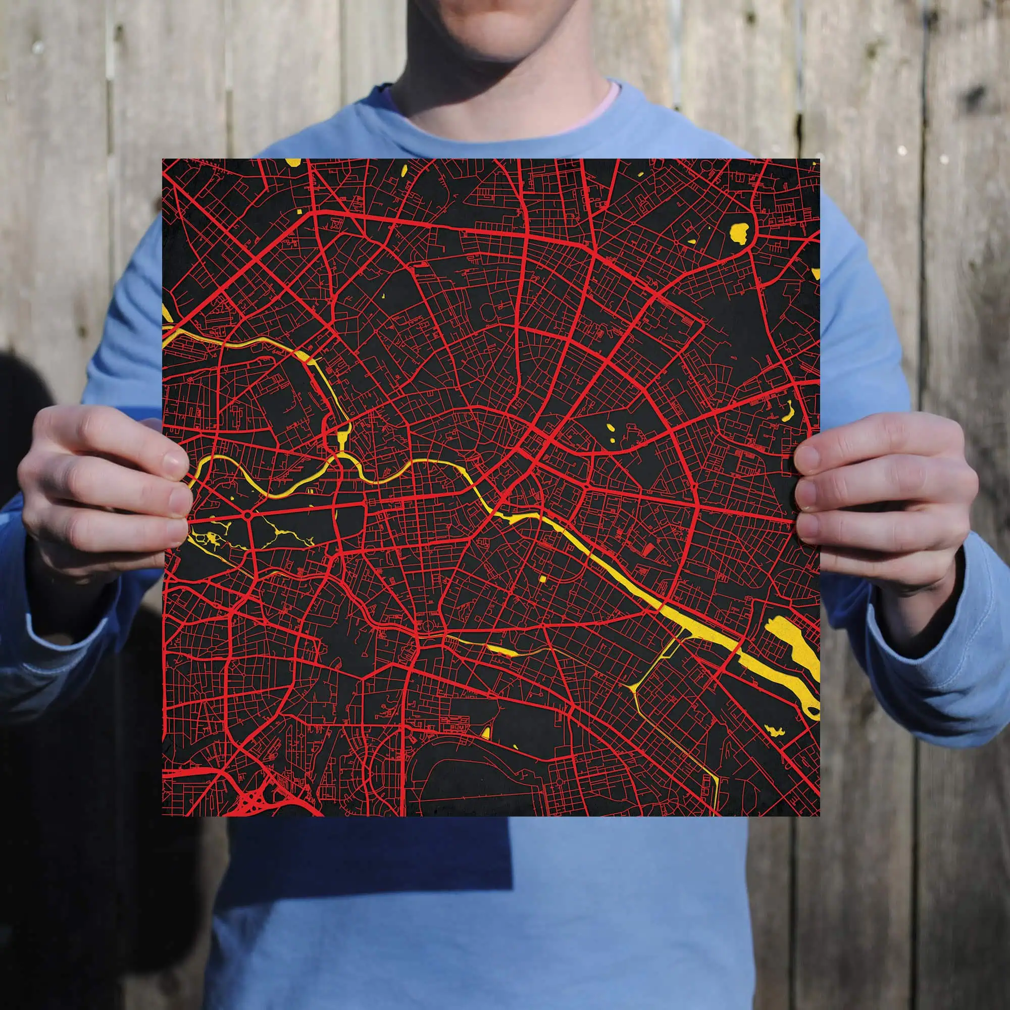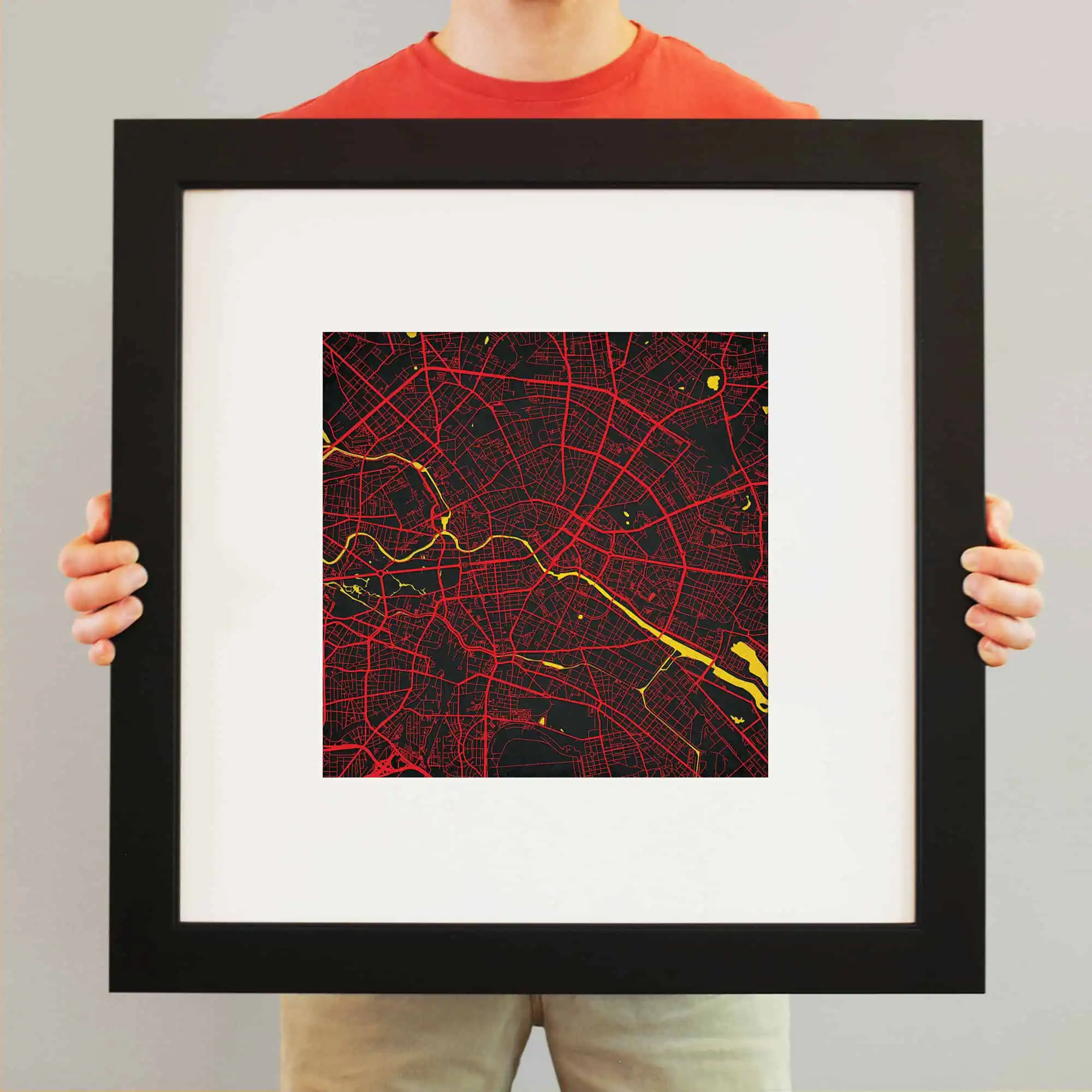 Colorful city map wall art featuring prominent street layouts and urban design, perfect for home or office decor, highlighting city navigation and geographic features.