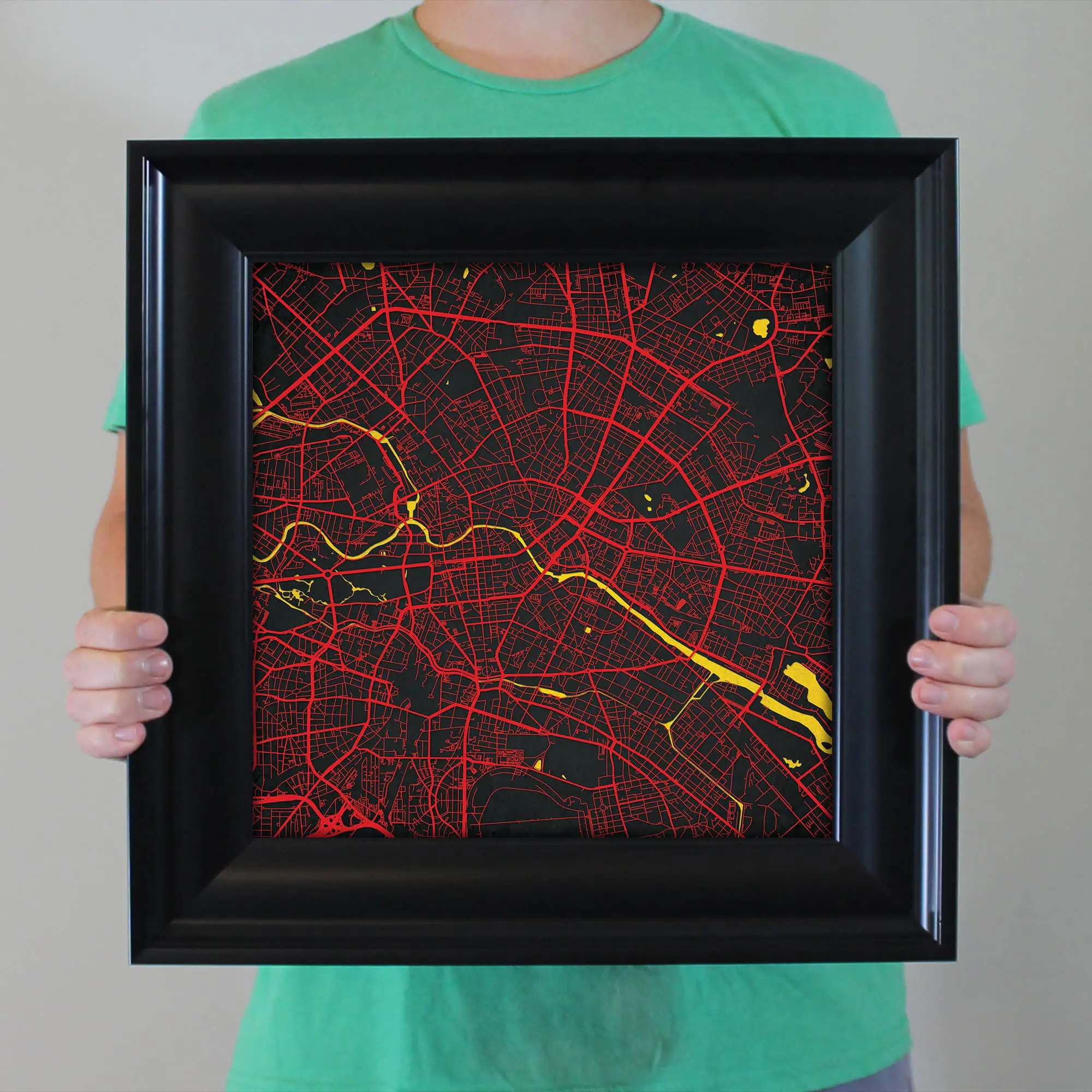 The size of this frame will vary depending on the size of the map you created. Frames are 16.5″ x 16.5″ for 12″ x 12″ prints and frames are 16.5″ x 20.5″ for 12″ x 16″ maps. Our frames have a black 2.75” wide heavy polystyrene molding. We choose to mount the prints without a glass/acrylic overlay, which shows off the unique properties of our paper stock when it hits the light. The back of the frame is sealed with a dust cover for added protection. Industrial silver hanging hardware is fixed to the back of the frame so it’s ready to hang on your wall.