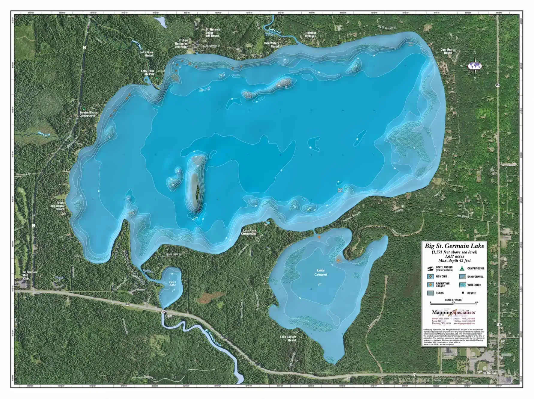 An Attractive map of the lake showing a visual 3D representation of the lake bottom. Includes boat launches, rock area and vegetation. Land area is high resolution aerial imagery.