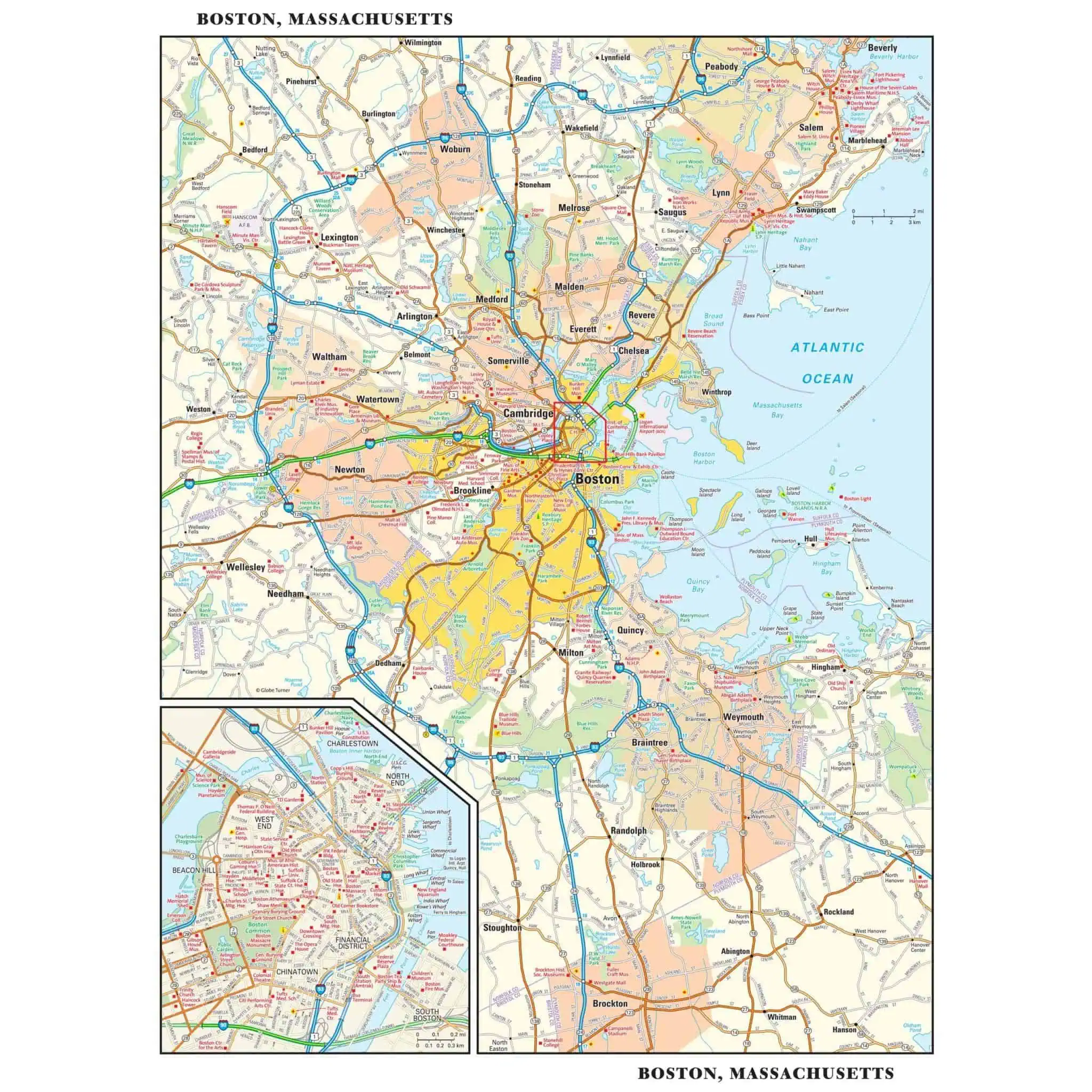 This detailed reference map combines two maps in one – a regional map of the Boston metropolitan area plus a street-level map of center-city Boston. The regional map shows the area’s cities and towns, highways and roads, and a variety of points of interest. Cambridge, Quincy, Salem and historic Lexington are among the neighboring cities and towns shown on this map. The highly detailed inset of central Boston shows highways, streets, parks, landmarks, and other points of interest. The North End, West End, Beacon Hill, and Chinatown are among the neighborhoods featured on this map.