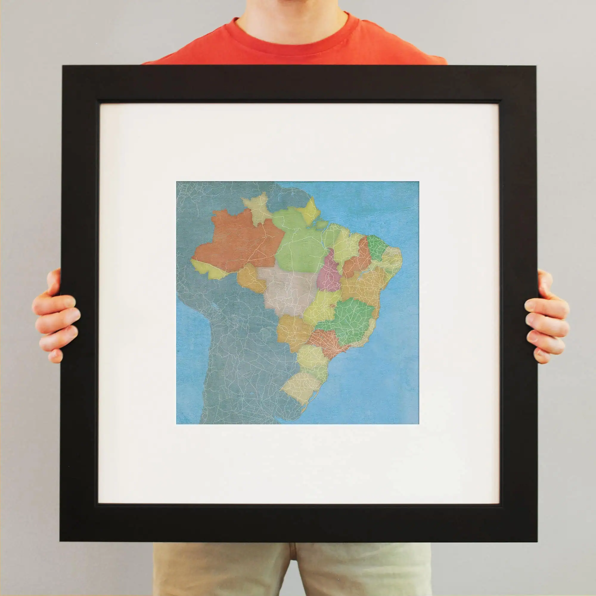 The size of this frame will vary depending on the size of the map you created. Frames are 23″ x 23″ for 12″ x 12″ prints and frames are 15.75″ x 19.75″ for 12″ x 16″ maps. Both frames have a black 1.75” wide genuine-wood molding. The print is enhanced with a soft white acid-free mat, which is bevel cut and placed on top of the print. The print and matt are protected by a premium crystal-clear acrylic overlay. The back of the frame is sealed with a dust cover for added protection. Industrial silver hanging hardware is bolted to the back of the frame so it’s ready to hang on your wall.