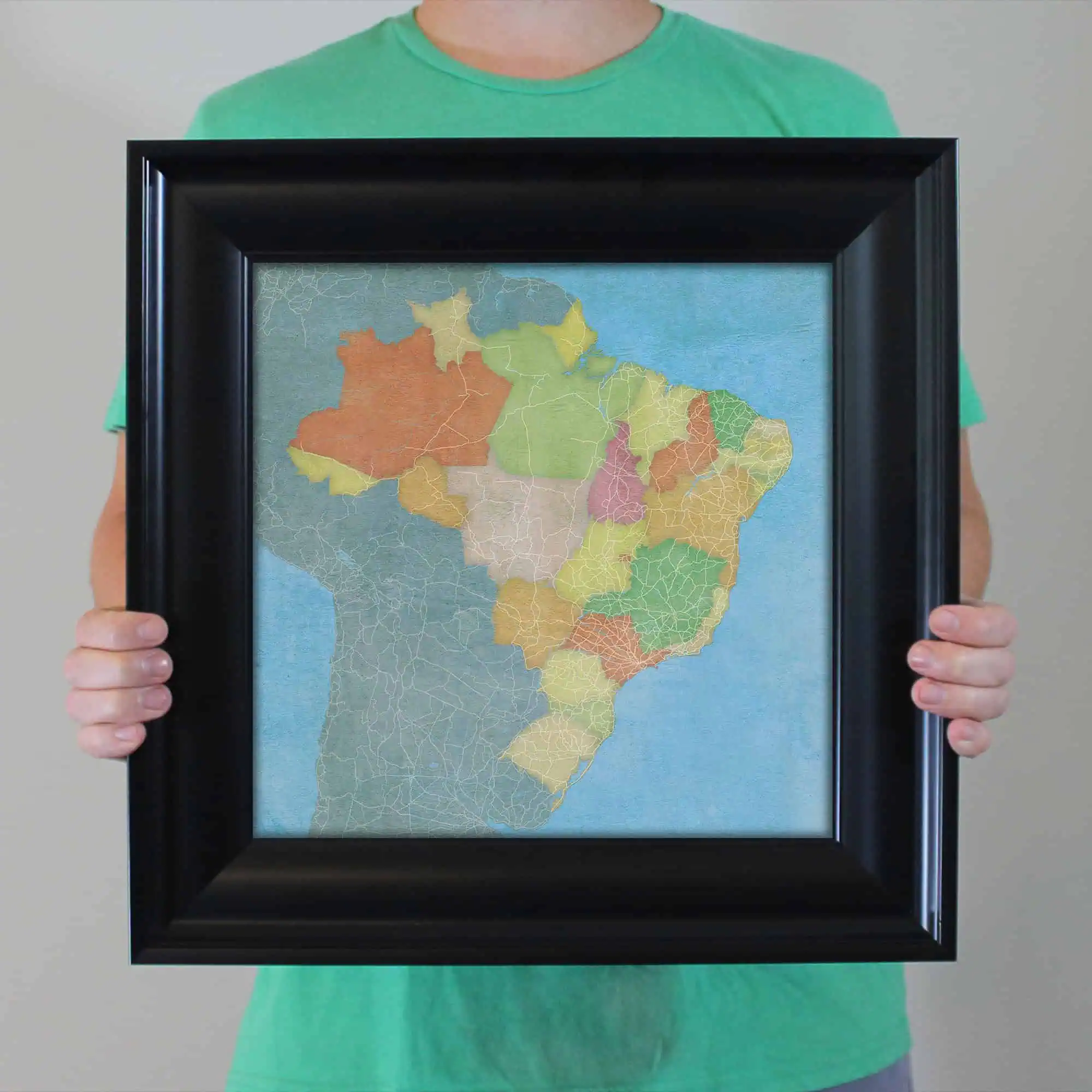The size of this frame will vary depending on the size of the map you created. Frames are 16.5″ x 16.5″ for 12″ x 12″ prints and frames are 16.5″ x 20.5″ for 12″ x 16″ maps. Our frames have a black 2.75” wide heavy polystyrene molding. We choose to mount the prints without a glass/acrylic overlay, which shows off the unique properties of our paper stock when it hits the light. The back of the frame is sealed with a dust cover for added protection. Industrial silver hanging hardware is fixed to the back of the frame so it’s ready to hang on your wall.