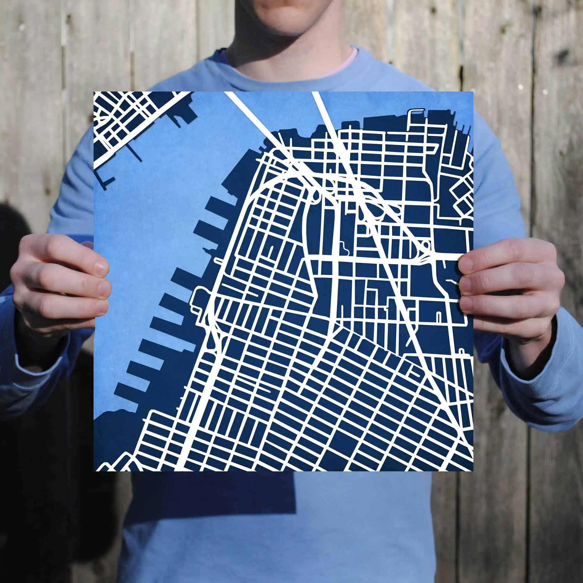 Colorful city map wall art featuring prominent street layouts and urban design, perfect for home or office decor, highlighting city navigation and geographic features.