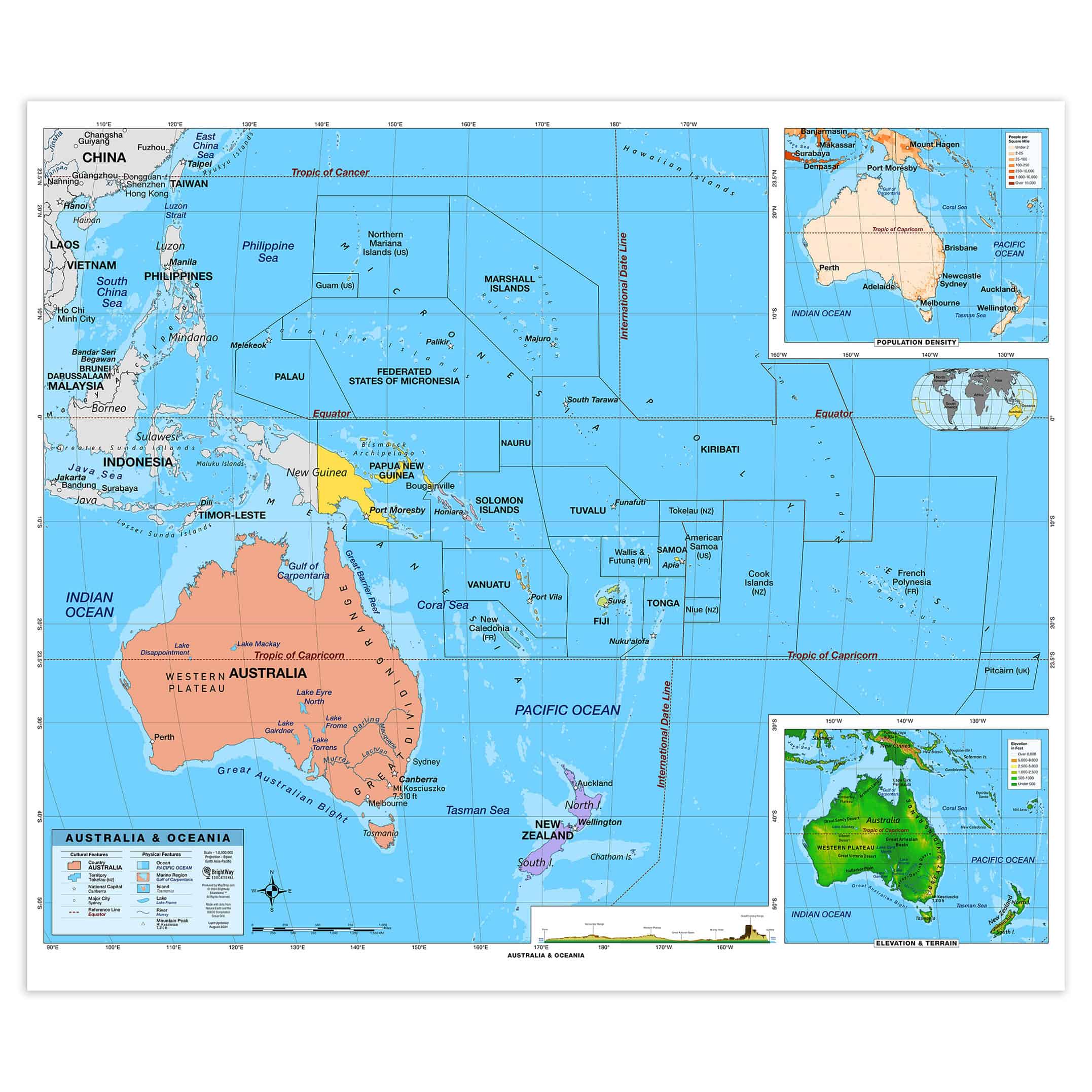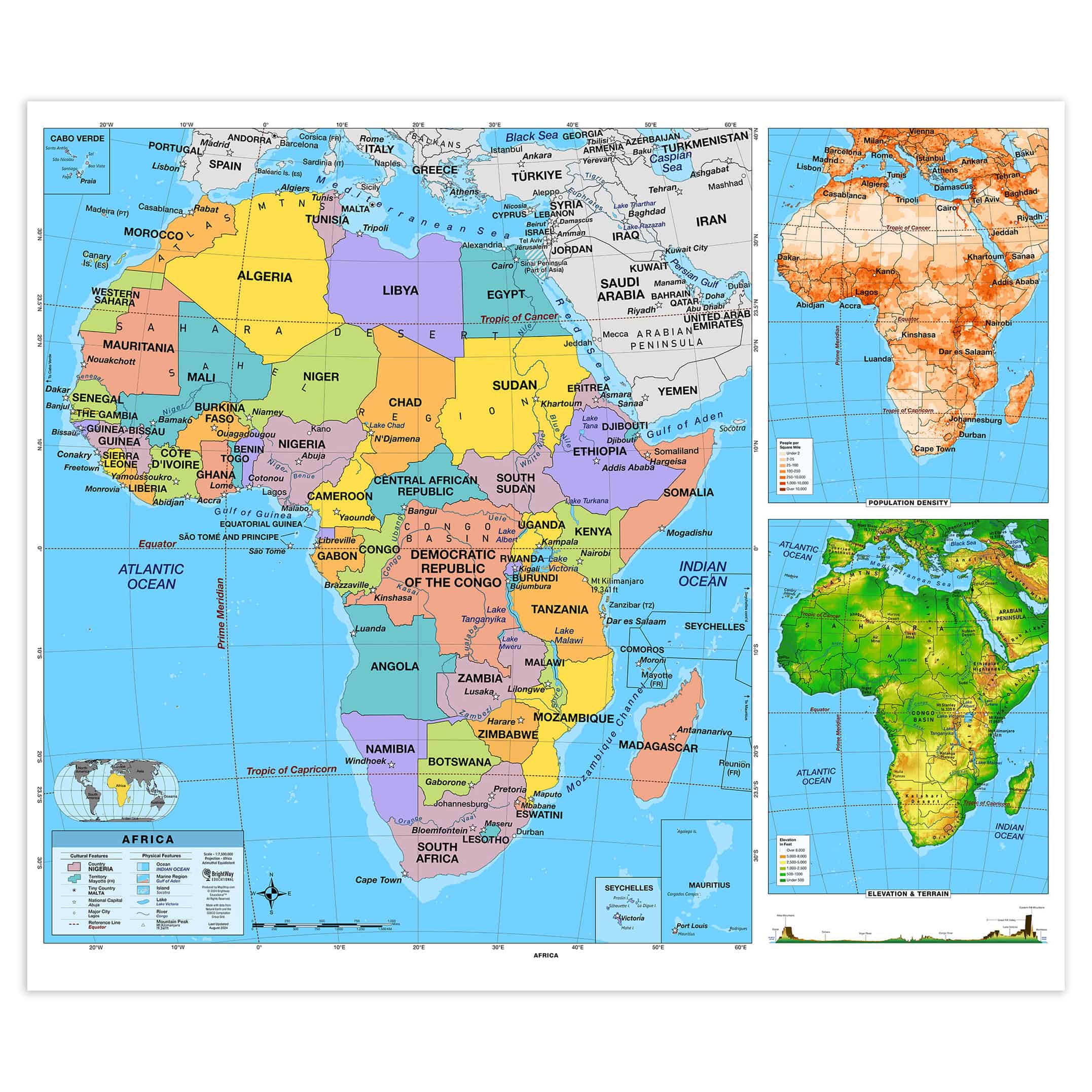 - Elevation & Terrain: An elevation ramp showcases the range of high and low elevations, with major physical features depicted in shaded relief and a side-on elevation profile for additional context.