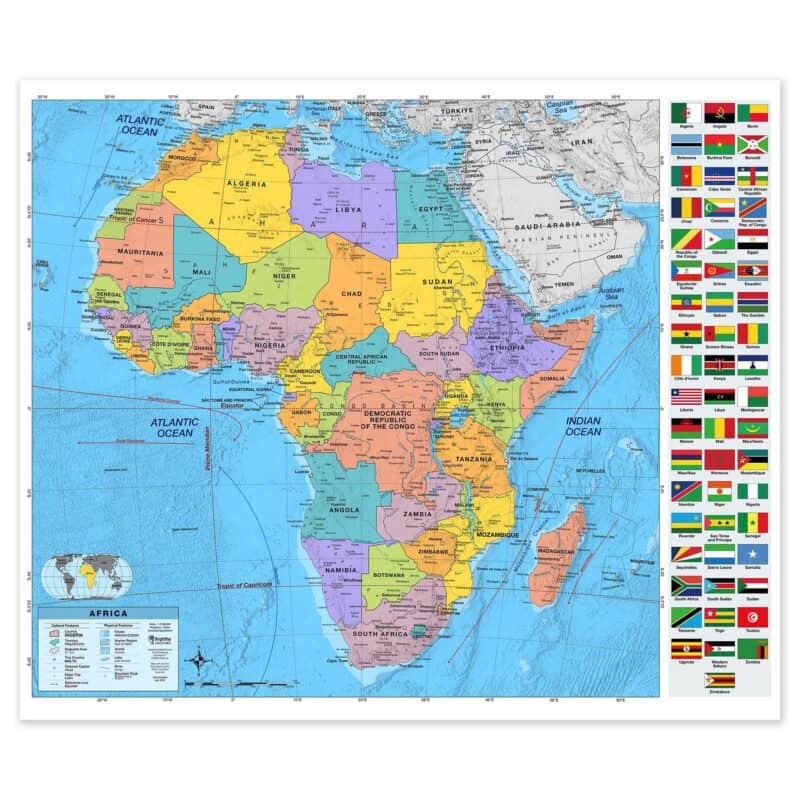 Bring geography to life with the Africa Advanced Political Classroom Wall Map by BrightWay Educational. Designed for grades 9+, this detailed map features a shaded relief map of Africa, with bright colors and incredible detail to aid in the clear understanding of countries, territories, and physical features. These maps were designed with teachers and built for students. This advanced map includes georeferencing & degree lines, national capitals, major and secondary cities, disputed borders, ocean currents, and bathymetric relief. Perfect for high school and college classrooms, these maps offer a deeper level of geographic detail. Regular updates ensure they’re among the most current educational maps available.Â