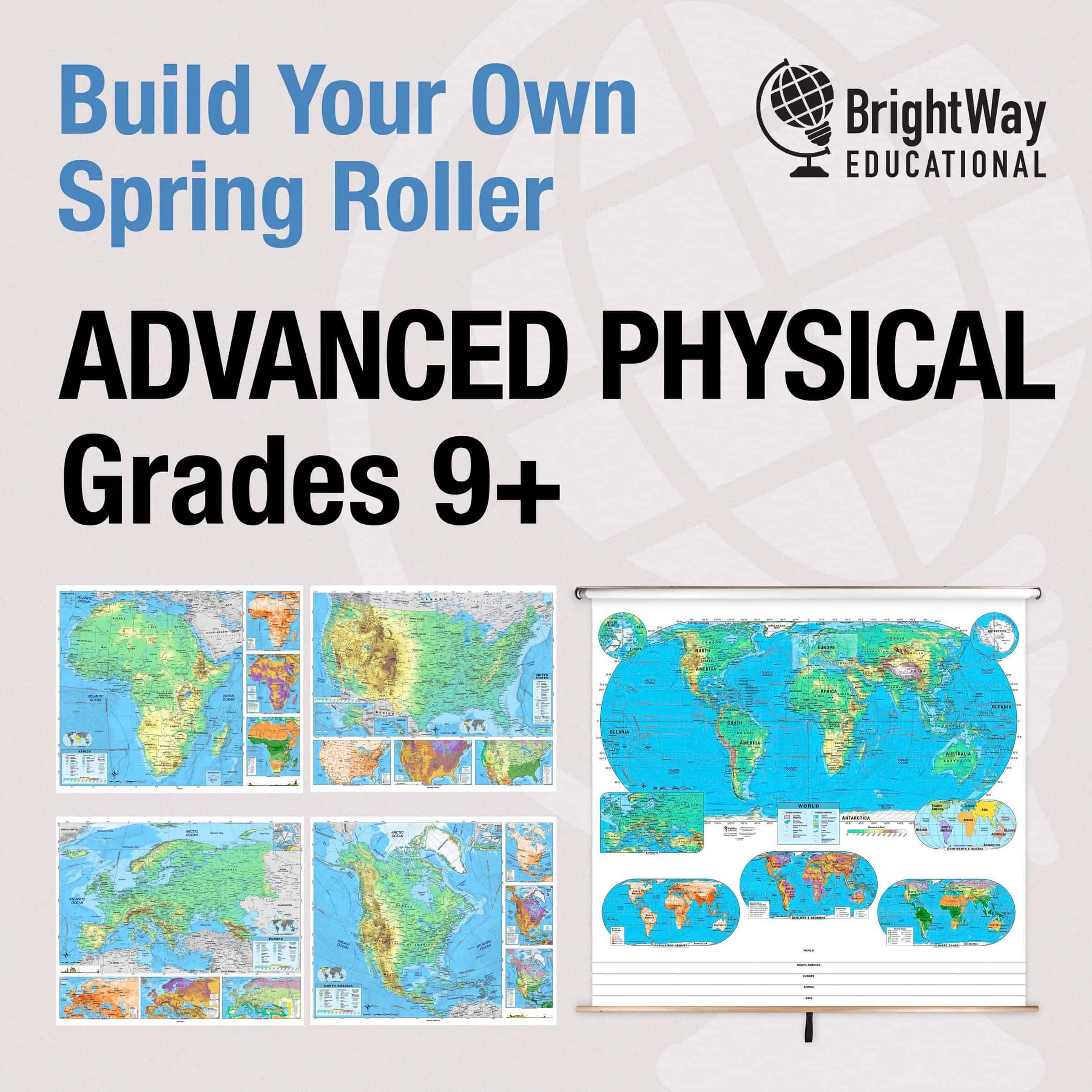 Bring geography to life with the Custom Advanced Physical Classroom Pull Down Map Set by BrightWay Educational. Designed for grades 9+, you can choose up to 8 of these vibrant maps to go on a single roller. Available maps include the World, United States, North America, South America, Europe, Africa, Asia, Australia/Oceania & Antarctica. These detailed maps feature shaded relief and vivid color to highlight countries, territories, and key physical features. Land is presented in each map with a colorful elevation ramp, instead of multi-color countries, to aid in the clear understanding of physical features. These maps were designed with teachers and built for students. This advanced map set includes georeferencing & degree lines, national capitals, major and secondary cities, ocean currents, and bathymetric relief. Perfect for high school and college classrooms, these maps offer a deeper level of geographic detail. Regular updates ensure they’re among the most current educational maps available.
