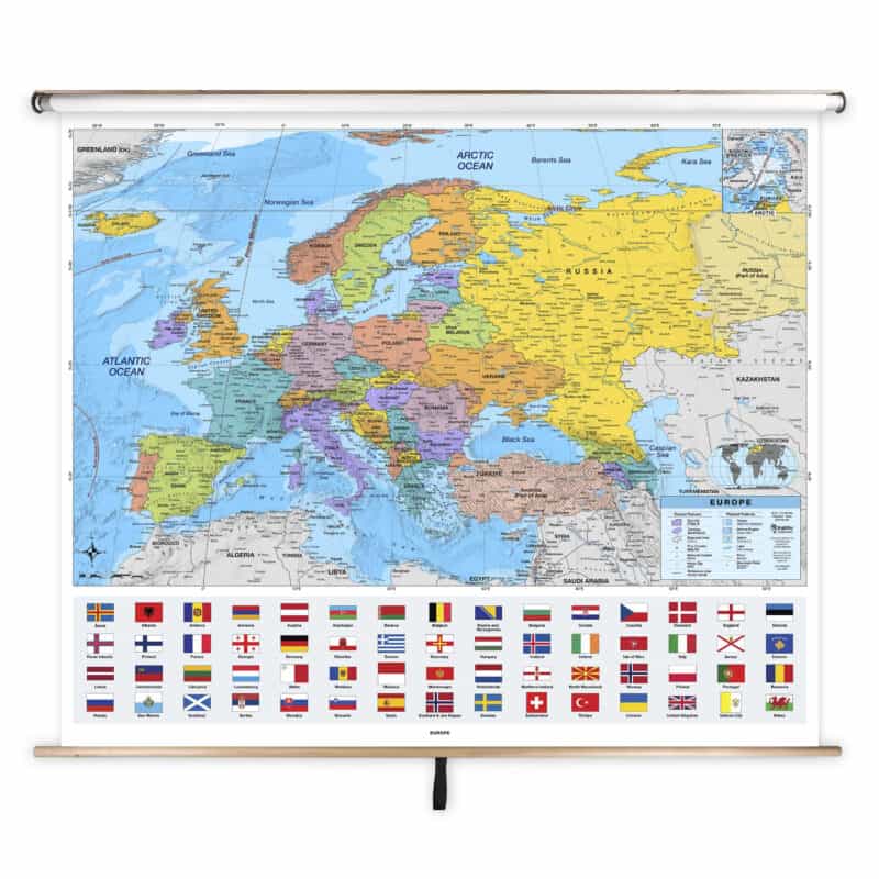 Bring geography to life with the Europe Advanced Political Classroom Pull Down Map by BrightWay Educational. Designed for grades 9+, this detailed map features a shaded relief map of Europe, with bright colors and incredible detail to aid in the clear understanding of countries, territories, and physical features. These maps were designed with teachers and built for students. This advanced map includes georeferencing & degree lines, national capitals, major and secondary cities, disputed borders, ocean currents, and bathymetric relief. Perfect for high school and college classrooms, these maps offer a deeper level of geographic detail. Regular updates ensure they’re among the most current educational maps available.Â