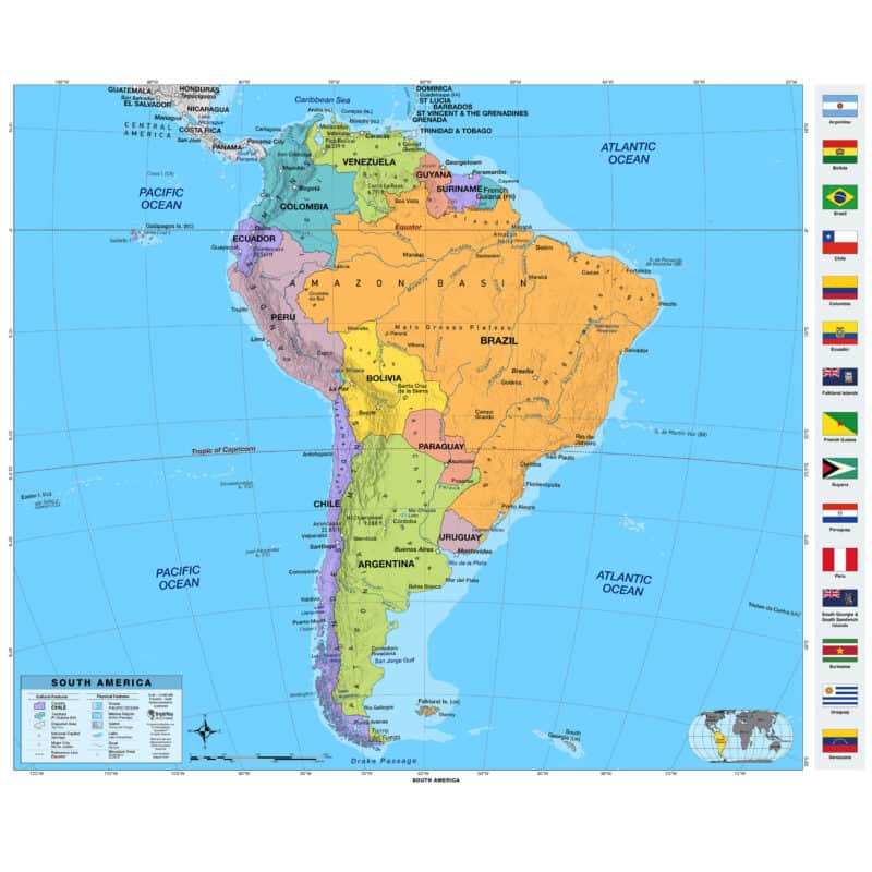 South America Political Wall Map, Countries and Capitals, by BrightWay Educational