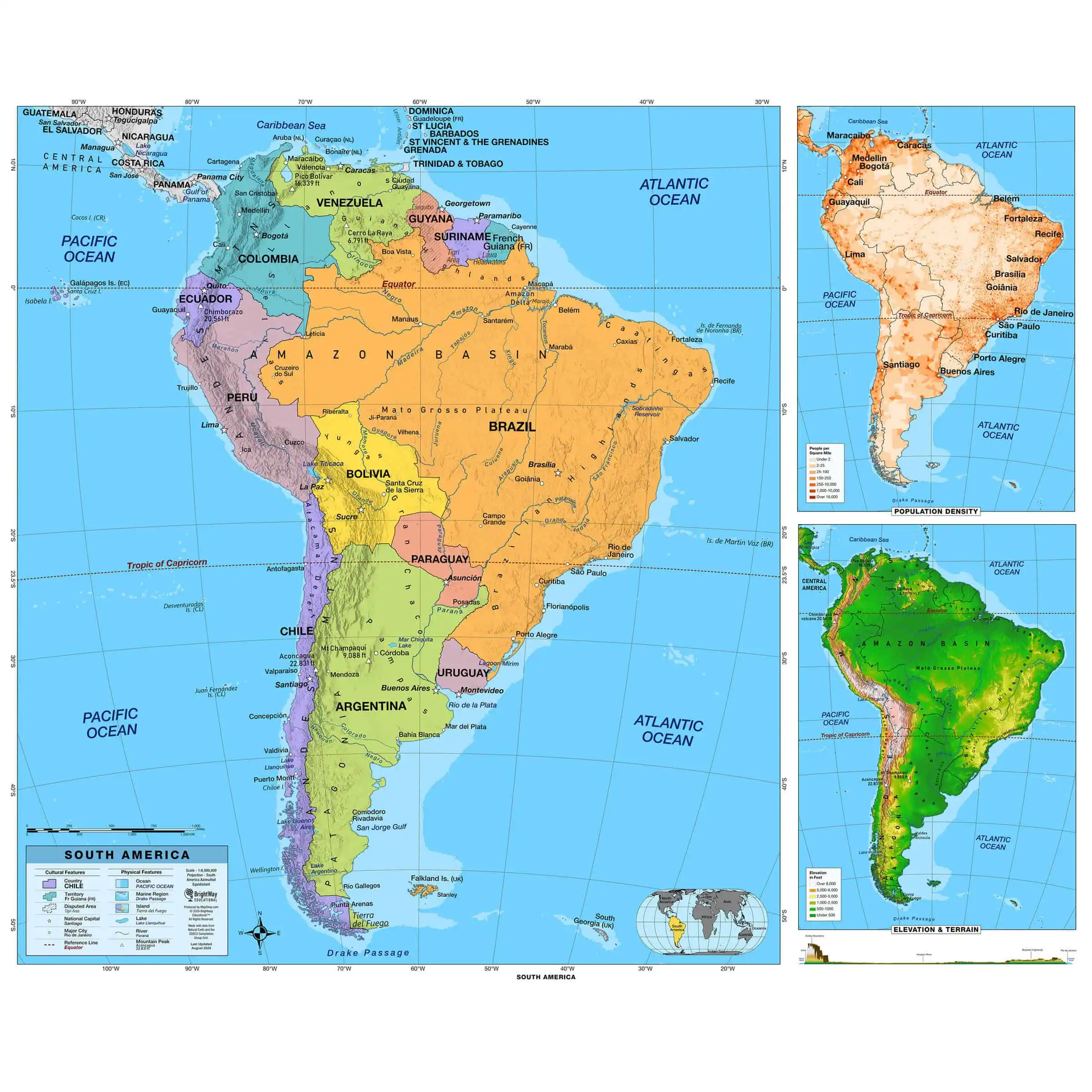 Bring geography to life with the South America Intermediate Classroom Wall Map by BrightWay Educational. Designed for grades 6-8, this detailed map features a shaded relief map the South America, with large, easy-to-read fonts and bright colors for clear differentiation of states. With additional details like degree lines, interstates, and state capitals & major cities, this map offers a more advanced exploration of geography for middle school students. These maps were developed alongside teachers to ensure they are perfect for enhancing classroom learning. These maps are constantly being updated, making the maps the most up-to-date on the market.