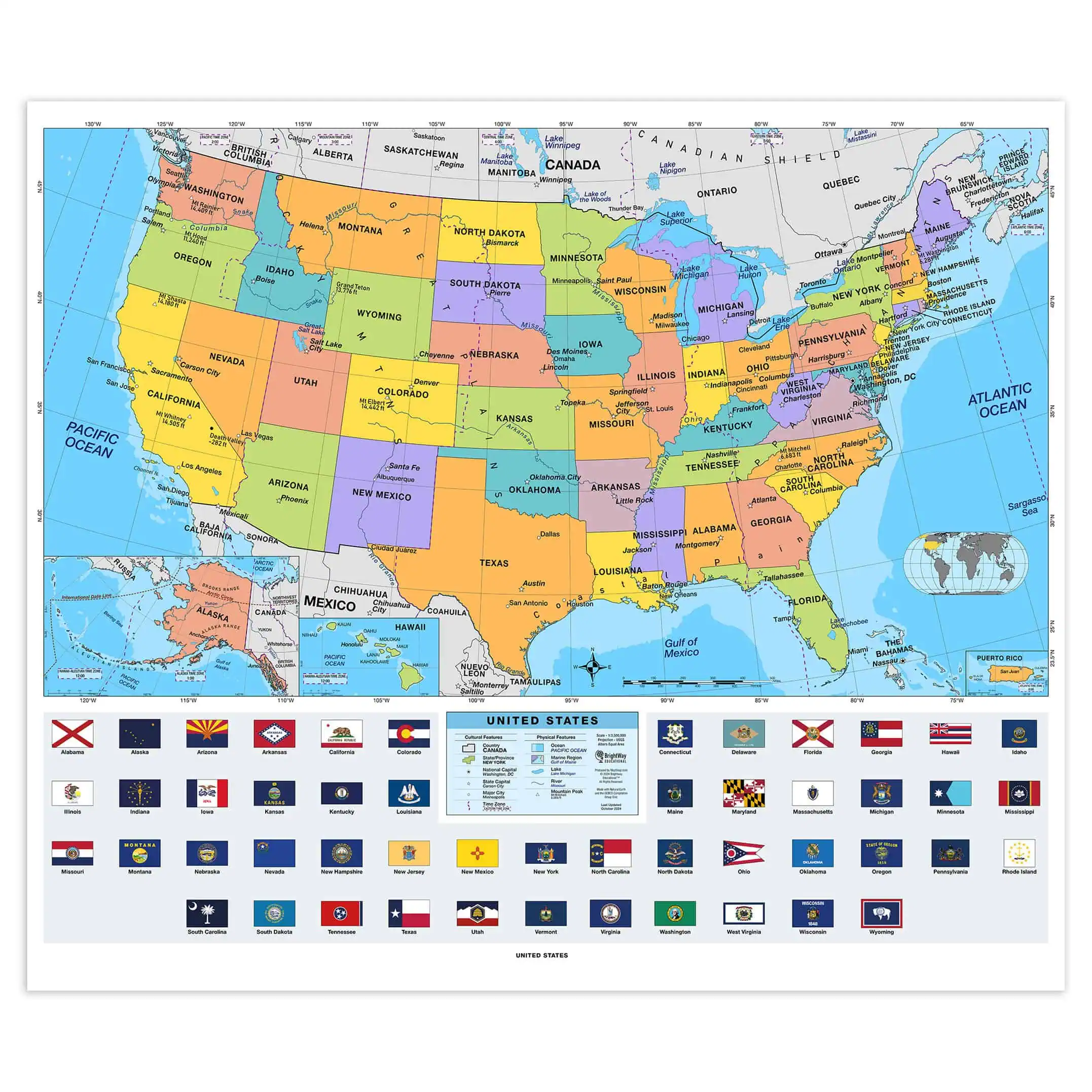 - Inset Detail: Features detailed insets of Alaska, Hawaii, and Puerto Rico provide a complete view of national geography.