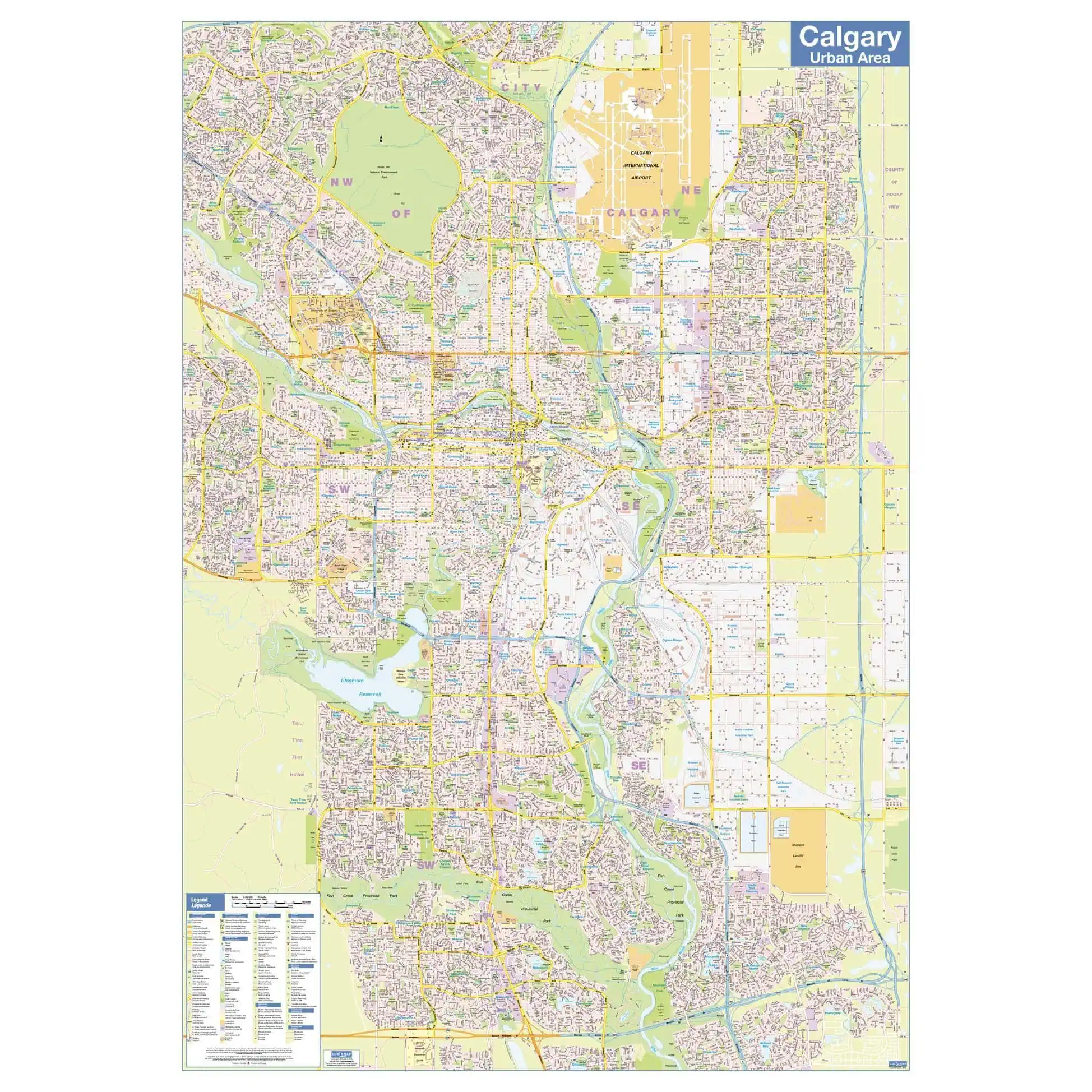 Map of downtown Calgary showing all roads, road names, political boundaries, transit, points of interest, parks, schools, churches, public buildings and landmarks. 28.5 x 40.5 in