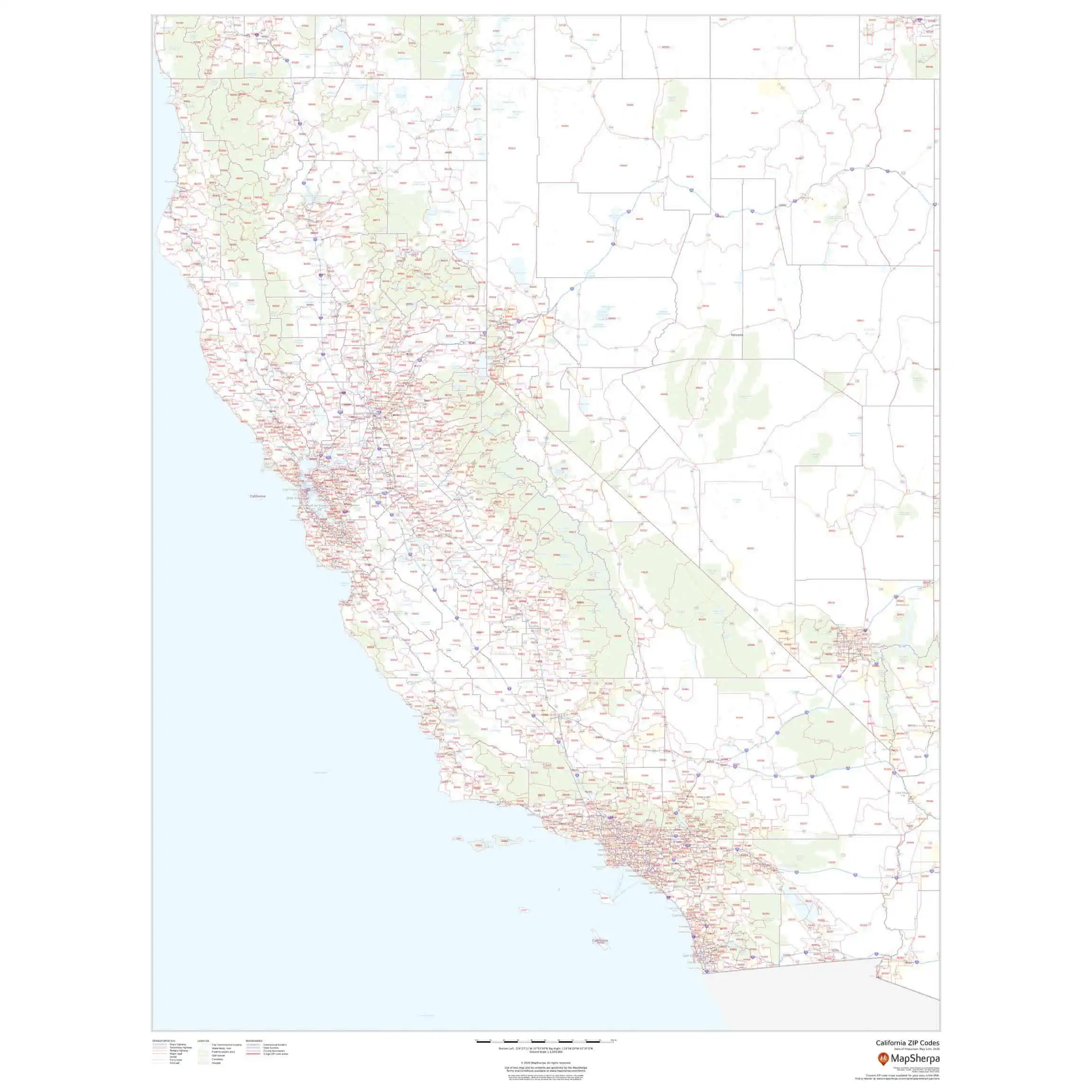 This map of California shows zip codes overlaid on a road map. Base map features include county boundaries, major road network features, and state and national parks and conservation areas.