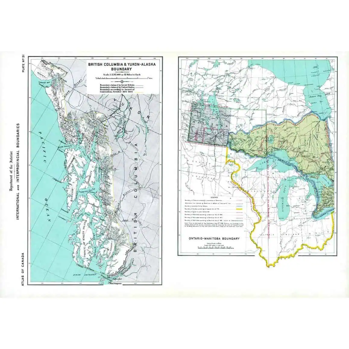 Contained within the 1st Edition (1906) of the Atlas of Canada is a plate that consists of 2 maps illustrating international and interprovincial boundary historical claims up to 1906. One map shows Ontario, Manitoba and adjacent parts of the US. The other map shows the Alaska boundary dispute. British Columbia and Yukon – Alaska boundary map displays the respective disputes of Great Britain and the United States, as well as the awarded boundary announced October 20th, 1905. The Ontario-Manitoba boundary map was concentrated on the contestation of the Dominion and Manitoba disputing the Ontario boundary on the west by prolongation of a due north line from the joining of the Ohio and Mississippi, as well as the height of land between the St. Lawrence and Hudson bay. In addition, major railway systems displayed.