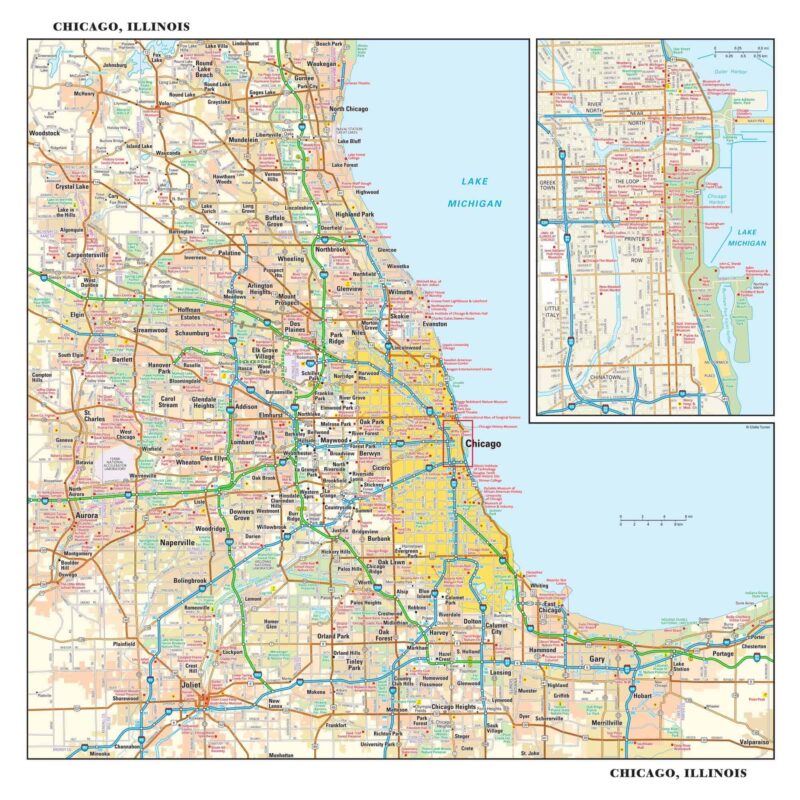 This detailed reference map combines two maps in one – a regional map of the Chicagoland area plus a street-level map of downtown Chicago. The regional map shows the area’s cities and towns, highways and roads, and a variety of points of interest. Joliet, Aurora, Elgin, and Highland Park are among the suburbs near Chicago that are featured on this map. The highly detailed inset of the Chicago central business district shows highways, streets, parks, landmarks, and other points of interest. The Loop, Printer’s Row, Chinatown, and the Near North are among the neighborhoods shown on this map. Developed by Globe Turner. 36″ x 34.8″