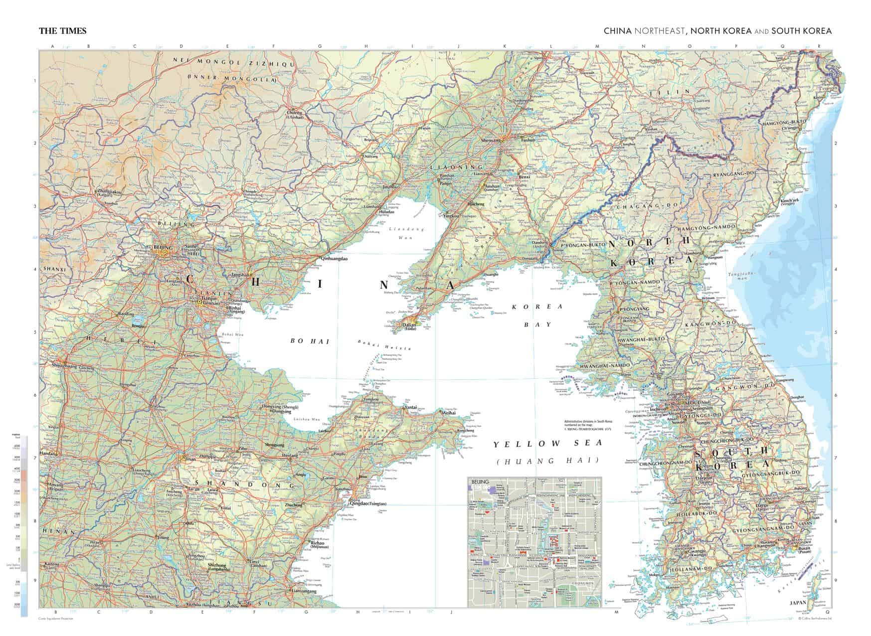 This map of North Korea, South Korea, and China's north-eastern region is a benchmark of cartographic excellence, taken from the industry leading Times Comprehensive Atlas of the World. Published in full colour, this map offers a comprehensive and updated view of this region's diverse landscape, prominent features such as the Yellow River, and the vibrant cities Seoul and Tianjin, and P'yongyang, are easily identifiable. Notably, the map also includes an inset map of China's capital city: Beijing, adding an extra layer of detail to this dynamic area. With meticulous attention to cartographic detail, this map is an indispensable guide to the geography of North Korea, South Korea, and China's north-eastern region.