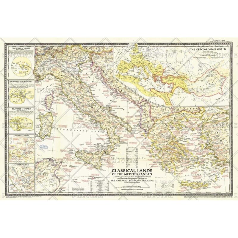Following World War II, Greece endured a bitter civil war that ended a couple months before this map was published in December 1949. The Classical Lands of the Mediterranean map celebrates the magnificent history of the Greek, Roman, and Phoenician civilizations with informative inset maps and an abundance of notes about historical and mythological sites.