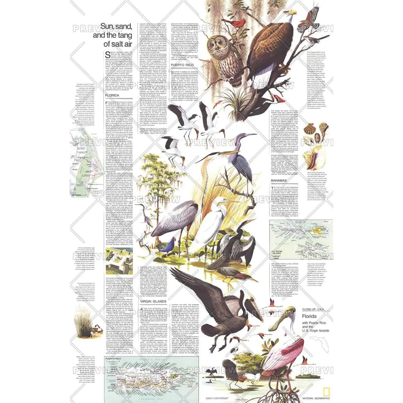 The “Florida, Puerto Rico, and the U.S. Virgin Islands: Sun, Sand, and the Tang of Salt Air” map is half of a two-map set. Published in November 1973, this travel map contains historical information about these three regions as well an introduction to the various tourist activities that abound in these tropical paradises.Â