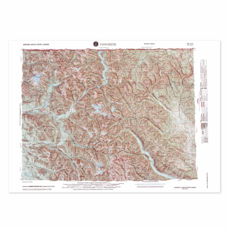 3D raised relief map of Concrete, WA with unframed dimensions of 26.75” x 21” This map is printed on 2mm thick high-grade rigid vinyl, then one of our technical artists heat-treats and vacuum-forms each individual print over our custom Concrete, WA mold. Showcase this beautiful city with a one-of-a-kind and fun to touch 3D raised relief map. It’s wall art, it’s a sculpture, and it’s a functional map!