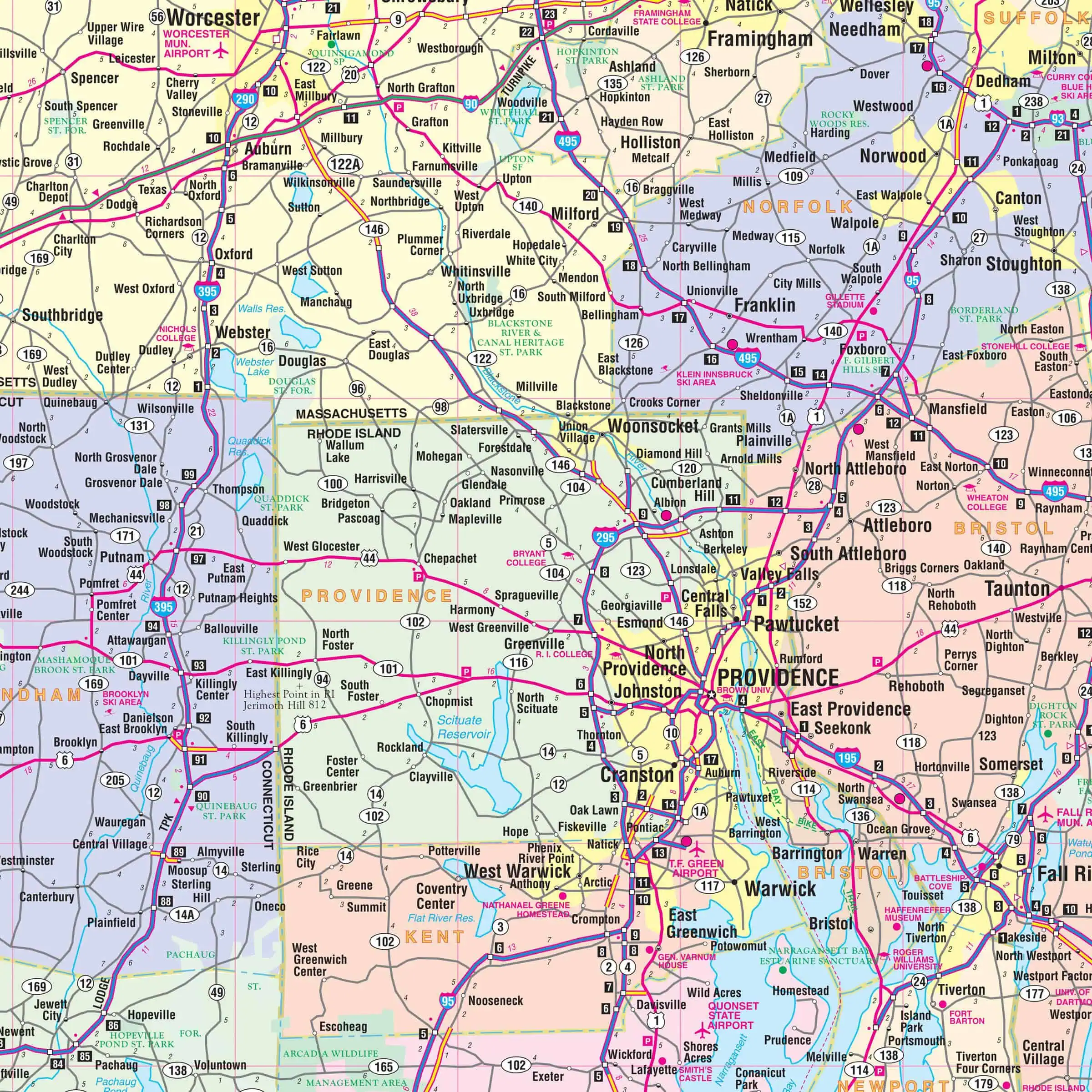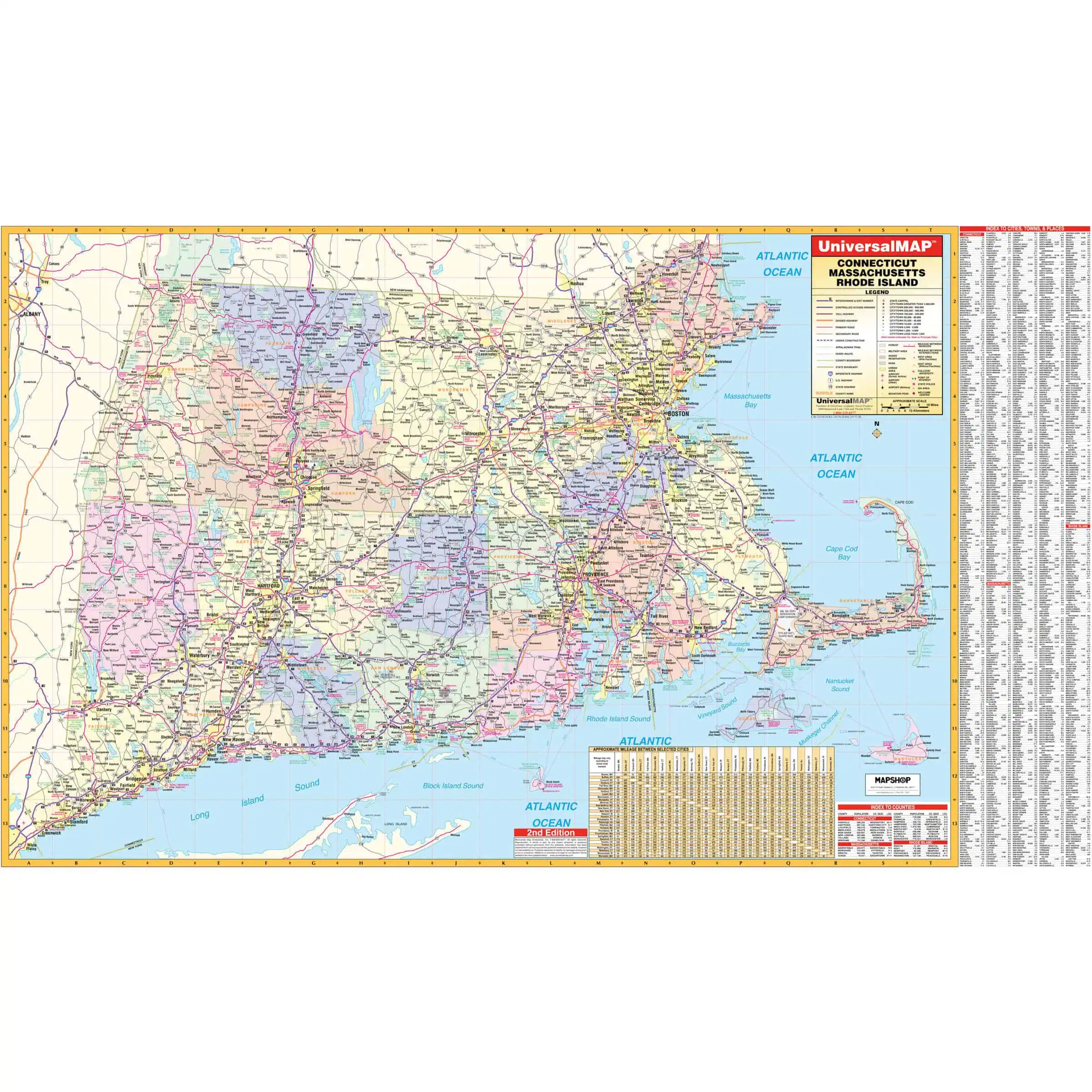 The Connecticut-Rhode Island-Massachusetts Tri-state Area Wall Map is published by Kappa Map Group. Indexing appears on the face of the map. Data, details, and information include all state and federal highways, military installations, major airports, state parks, cities and towns, state universities, wild life areas, and points of interest.