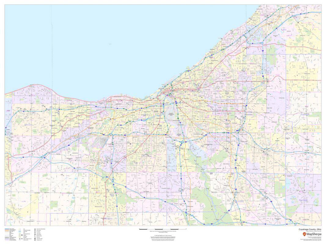 This map of Cuyahoga County, Ohio shows regional level information. Base map features include highways and major roads with labelling; neighborhood names; railways; high level land use such as parks and recreation areas, industrial areas and hospital campuses; and a selection of points of interest including transportation hubs like airports and train stations, tourist information, police stations and shopping centres. ZIP code boundaries are shown as a secondary map feature.