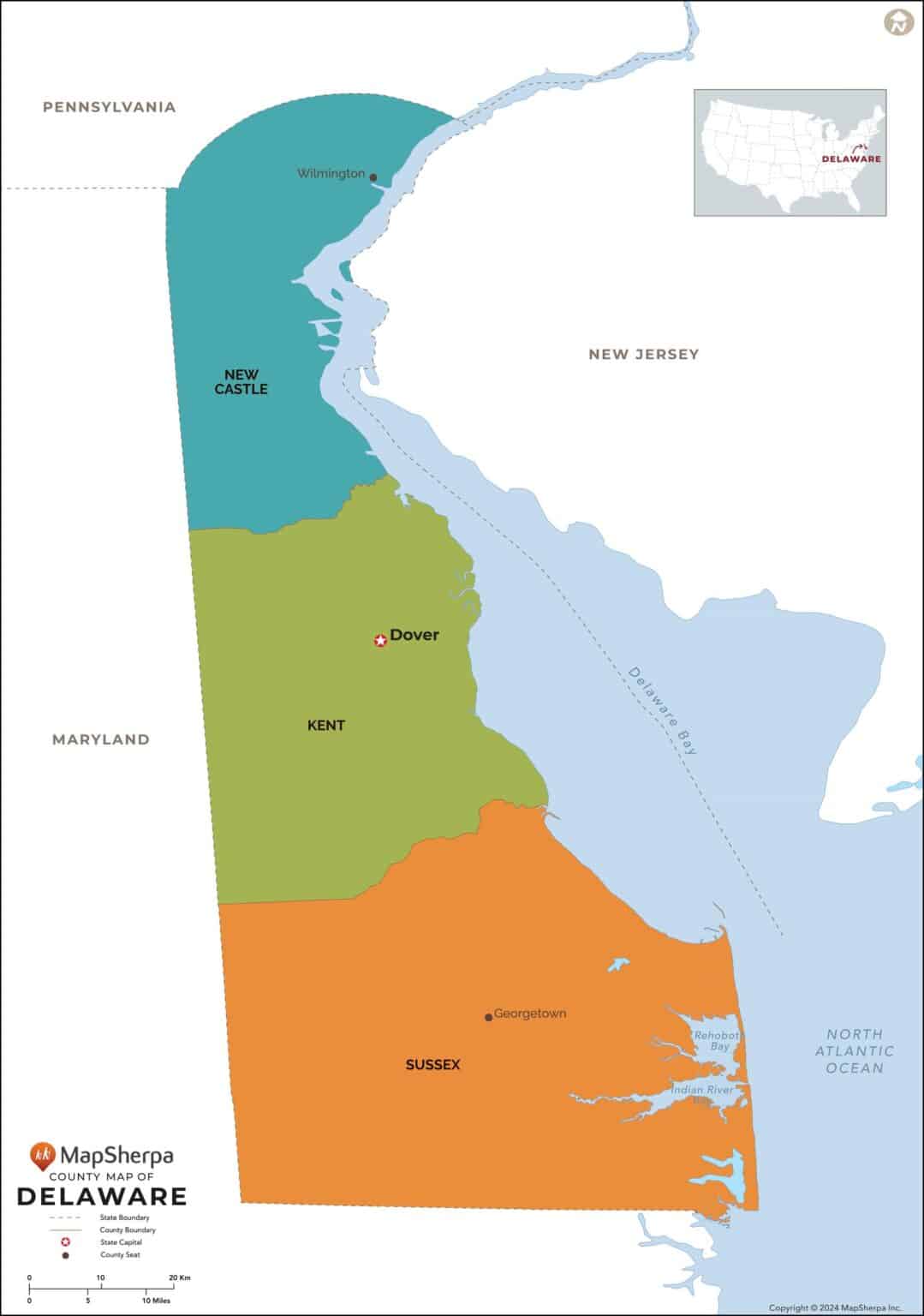 This map has been created exclusively for MapSherpa, and designed for reference or business use. Clear and clean colors & fonts matched with cartographic research makes this map of the 3 Delaware counties easily readable and useful.