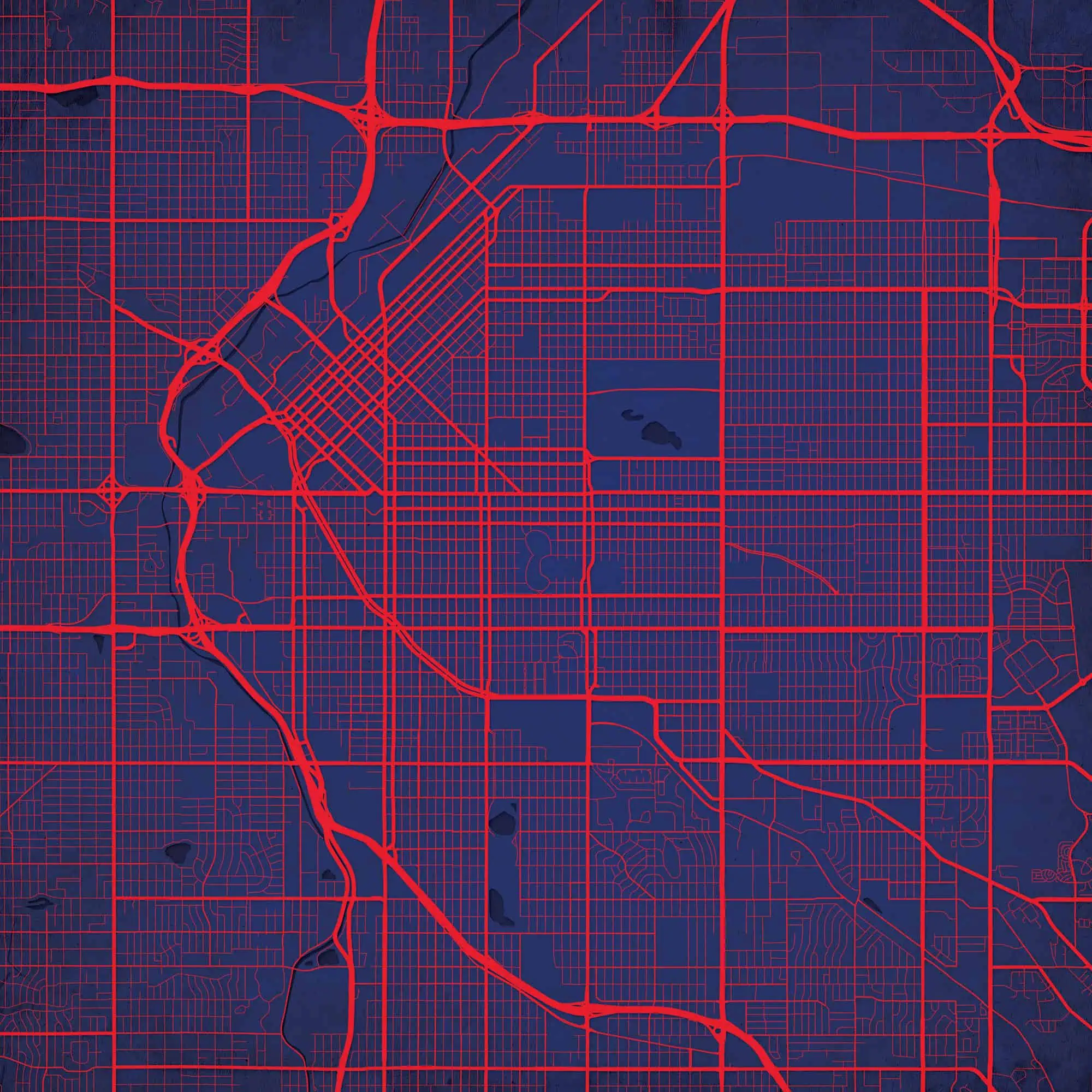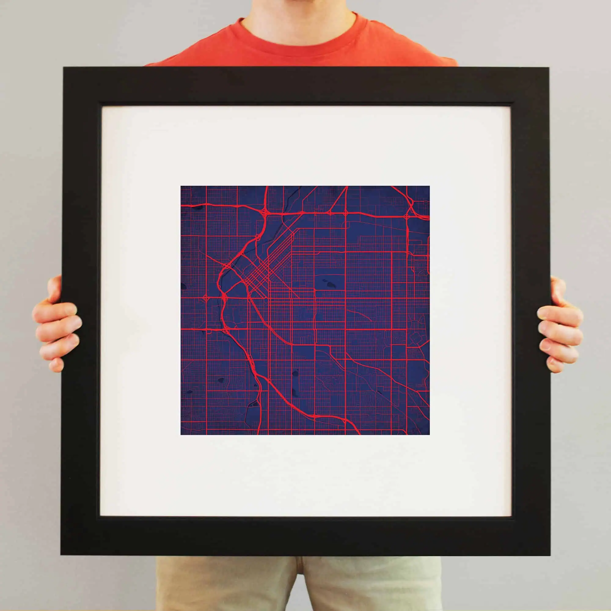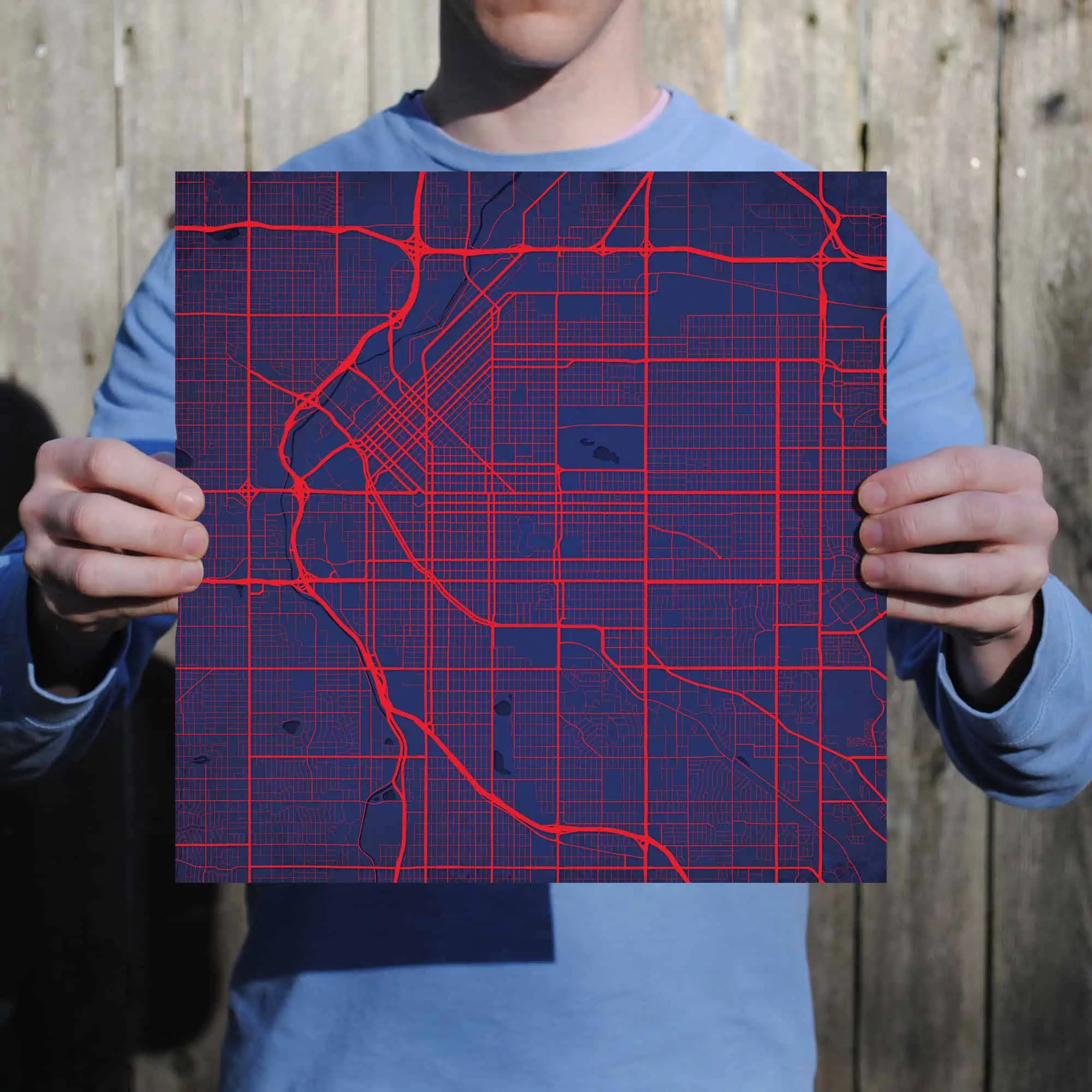 Colorful city map wall art featuring prominent street layouts and urban design, perfect for home or office decor, highlighting city navigation and geographic features.