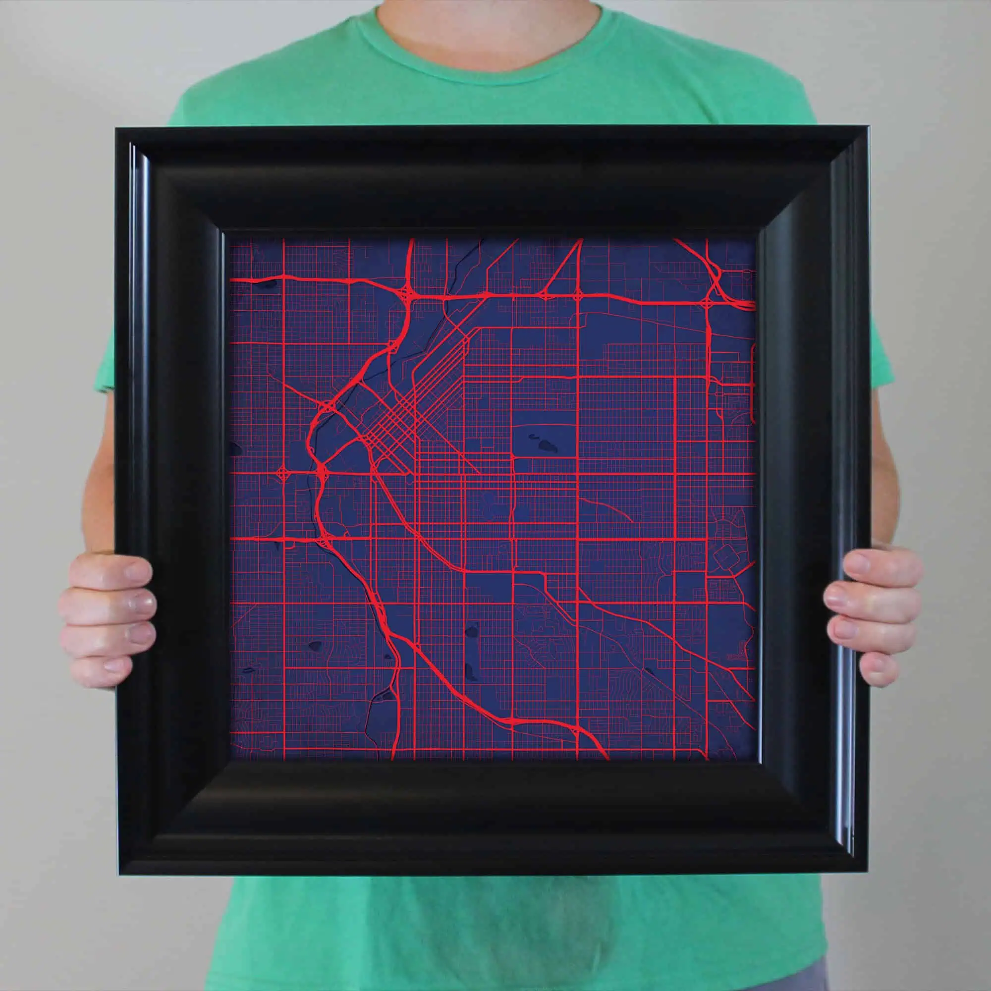 The size of this frame will vary depending on the size of the map you created. Frames are 16.5″ x 16.5″ for 12″ x 12″ prints and frames are 16.5″ x 20.5″ for 12″ x 16″ maps. Our frames have a black 2.75” wide heavy polystyrene molding. We choose to mount the prints without a glass/acrylic overlay, which shows off the unique properties of our paper stock when it hits the light. The back of the frame is sealed with a dust cover for added protection. Industrial silver hanging hardware is fixed to the back of the frame so it’s ready to hang on your wall.