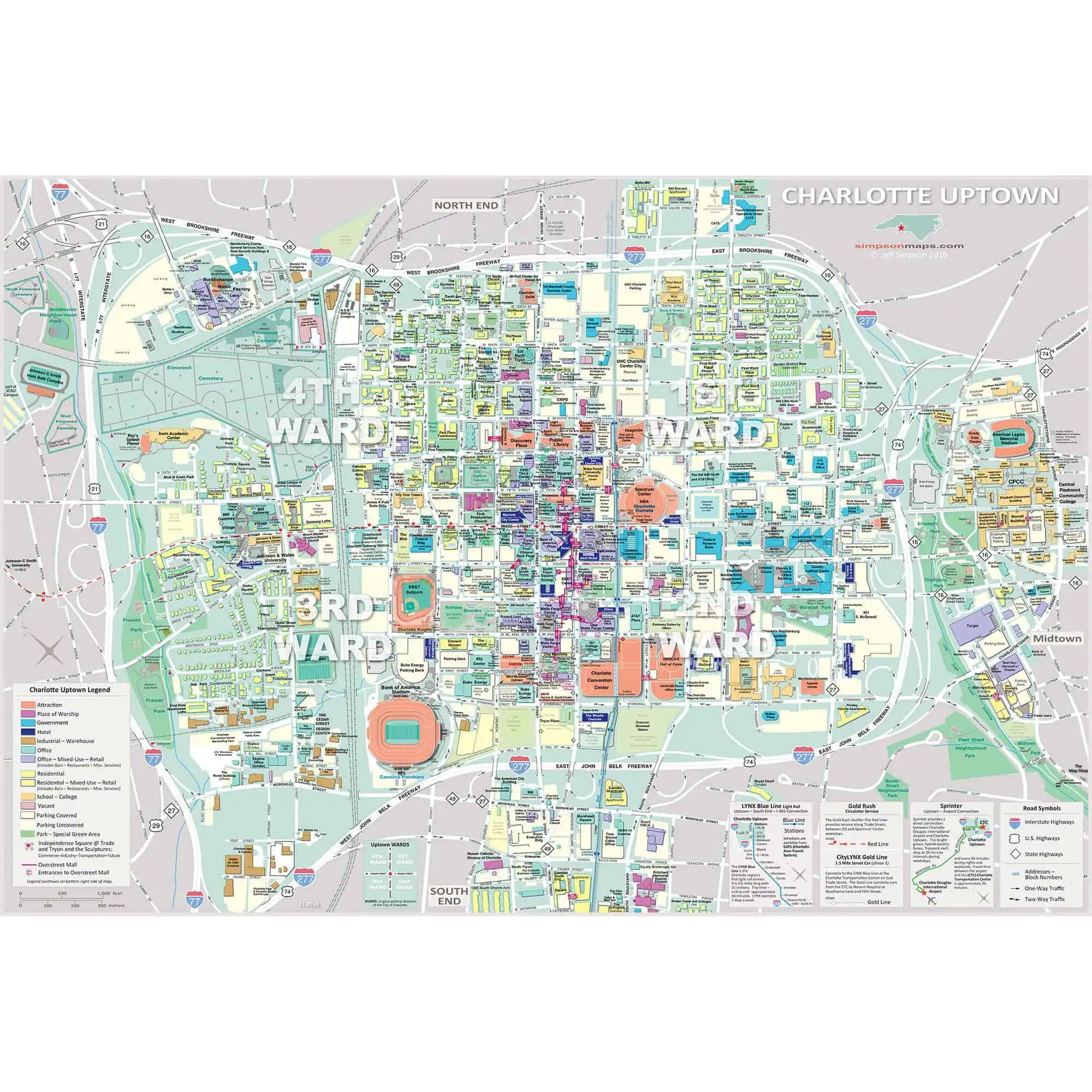 Wall map showing roads and buildings in Uptown Charlotte, North Carolina. This map does a good job of showing all the streets in the center of Charlotte and is the most detailed and up-to-date map of the area that you can buy. It is created by well-known Charlotte-based Cartographer, Jeff Simpson. Available in four sizes: 78″ x 54″, 62″ x 42″, 36″ x 24″ and 19″ x 13″.
