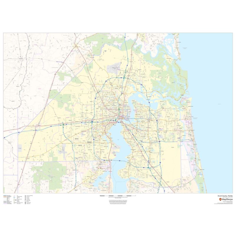 This map of Duval County, Florida shows regional level information. Base map features include highways and major roads with labelling; neighborhood names; railways; high level land use such as parks and recreation areas, industrial areas and hospital campuses; and a selection of points of interest including transportation hubs like airports and train stations, tourist information, police stations and shopping centres. zip code boundaries are shown as a secondary map feature.