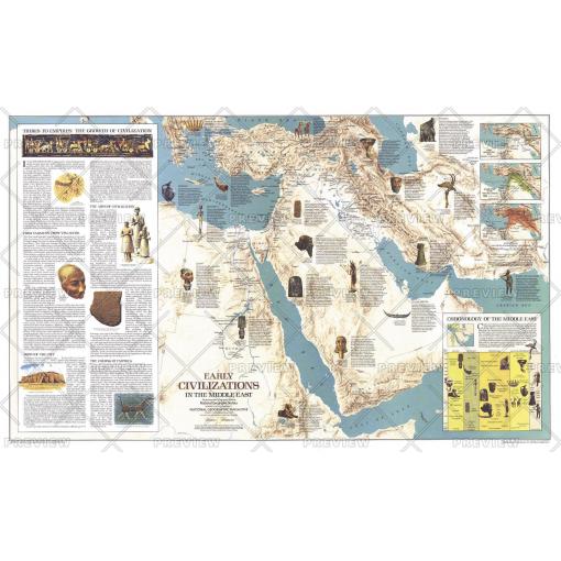 This fascinating map features a thorough overview of the history of the Middle East region and the civilizations who called it home. Includes illustrations of artifacts. Published in September 1978 as a companion to the “Middle East” political map.