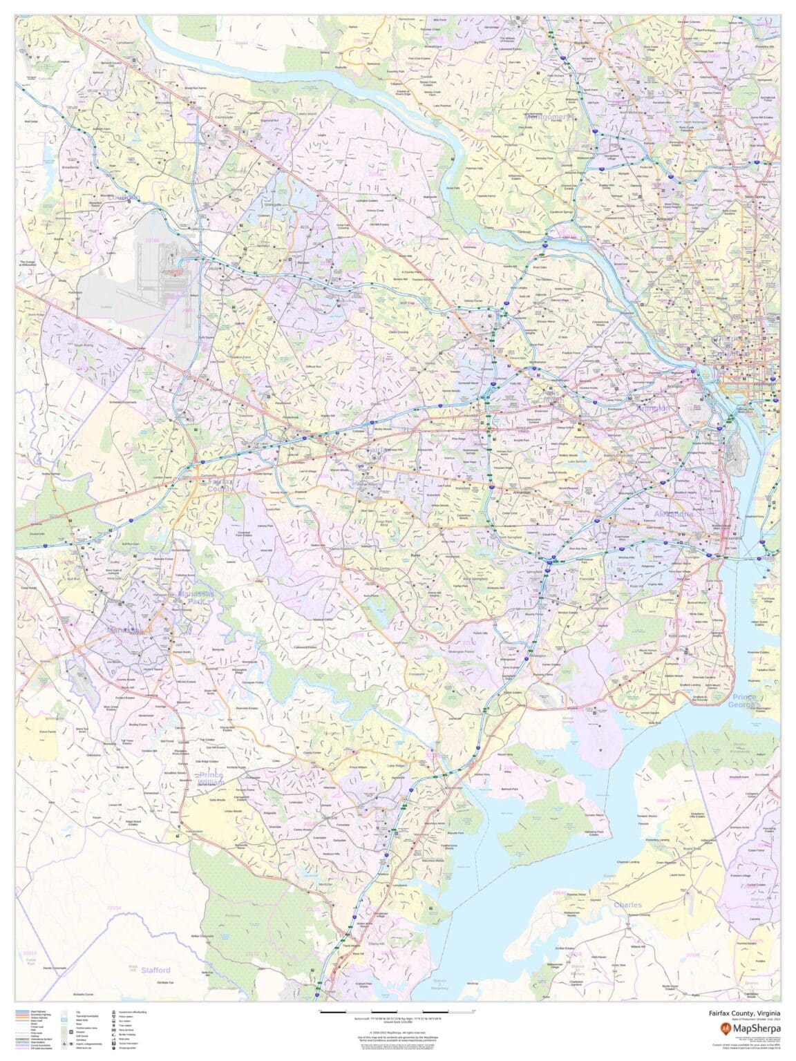 This map of Fairfax County, Virginia shows regional level information. Base map features include highways and major roads with labelling; neighborhood names; railways; high level land use such as parks and recreation areas, industrial areas and hospital campuses; and a selection of points of interest including transportation hubs like airports and train stations, tourist information, police stations and shopping centres. ZIP code boundaries are shown as a secondary map feature.