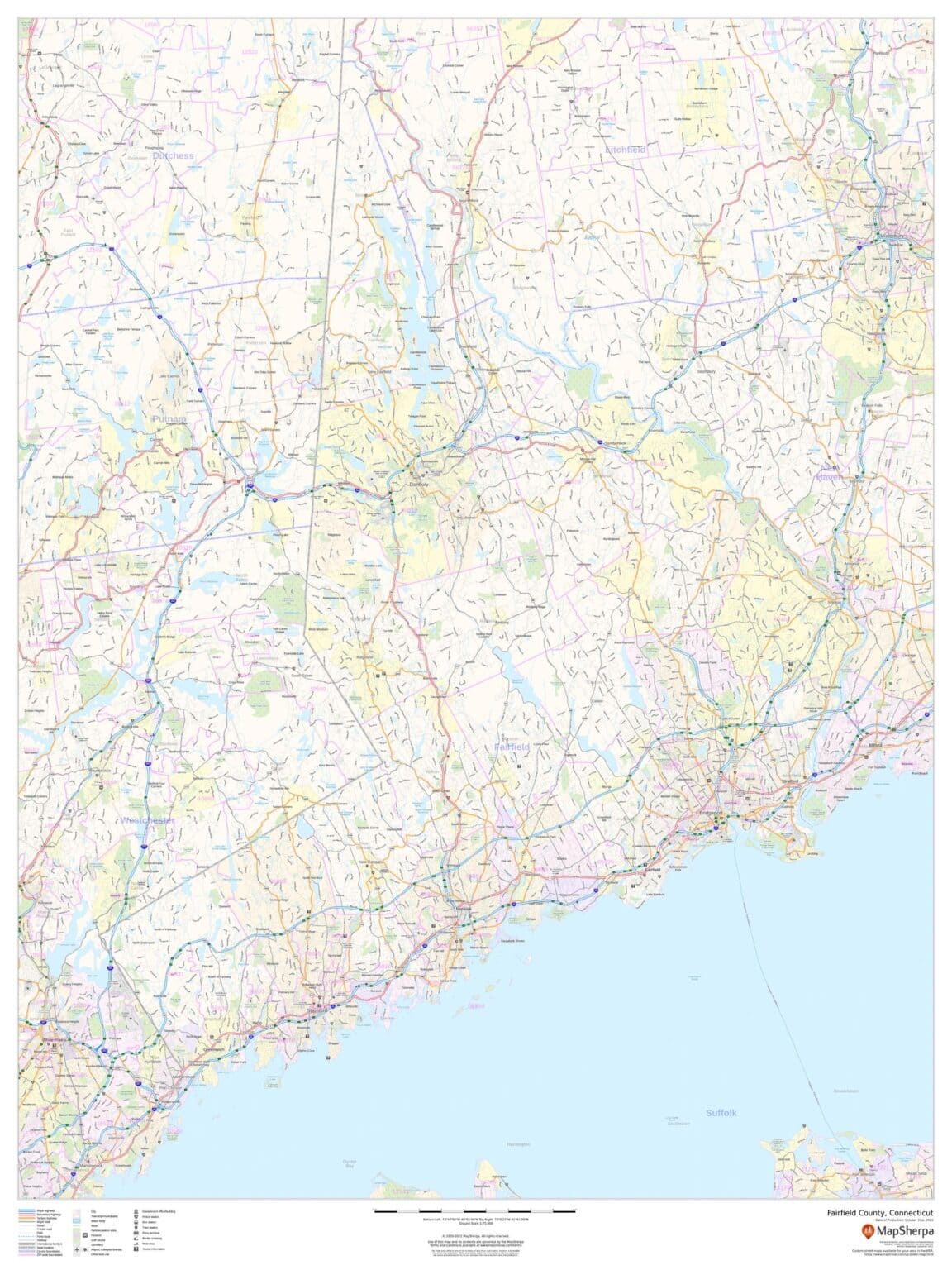 This map of Fairfield County, Connecticut shows regional level information. Base map features include highways and major roads with labelling; neighborhood names; railways; high level land use such as parks and recreation areas, industrial areas and hospital campuses; and a selection of points of interest including transportation hubs like airports and train stations, tourist information, police stations and shopping centres. ZIP code boundaries are shown as a secondary map feature.
