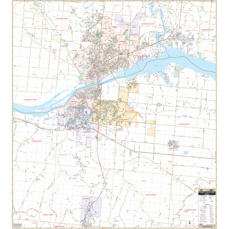 The Florence and Muscle Shoals Wall Map offers comprehensive street-level detail, covering Florence, Muscle Shoals, and their surrounding areas. The coverage extends as follows: