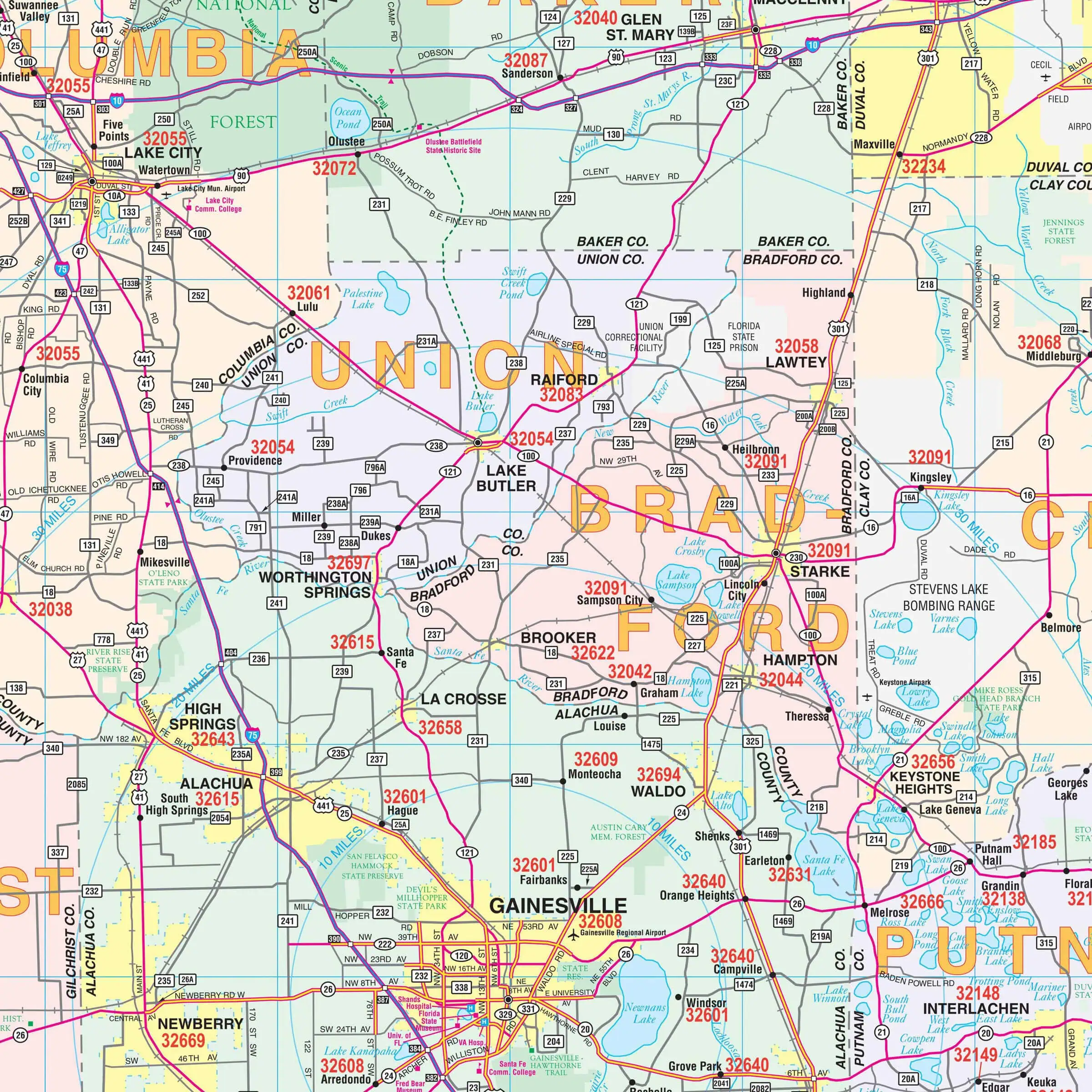 Counties include Alachua, Baker, Bradford, Clay, Columbia, Dixie, Duval, Flagler, Gilchrist, Hamilton, Jefferson, Lafayette, Leon, Levy, Madison, Marion, Nassau, Putnam, St. Johns, Suwannee, Taylor, Union, and portions of Volusia, Lake, Sumter, and Citrus.