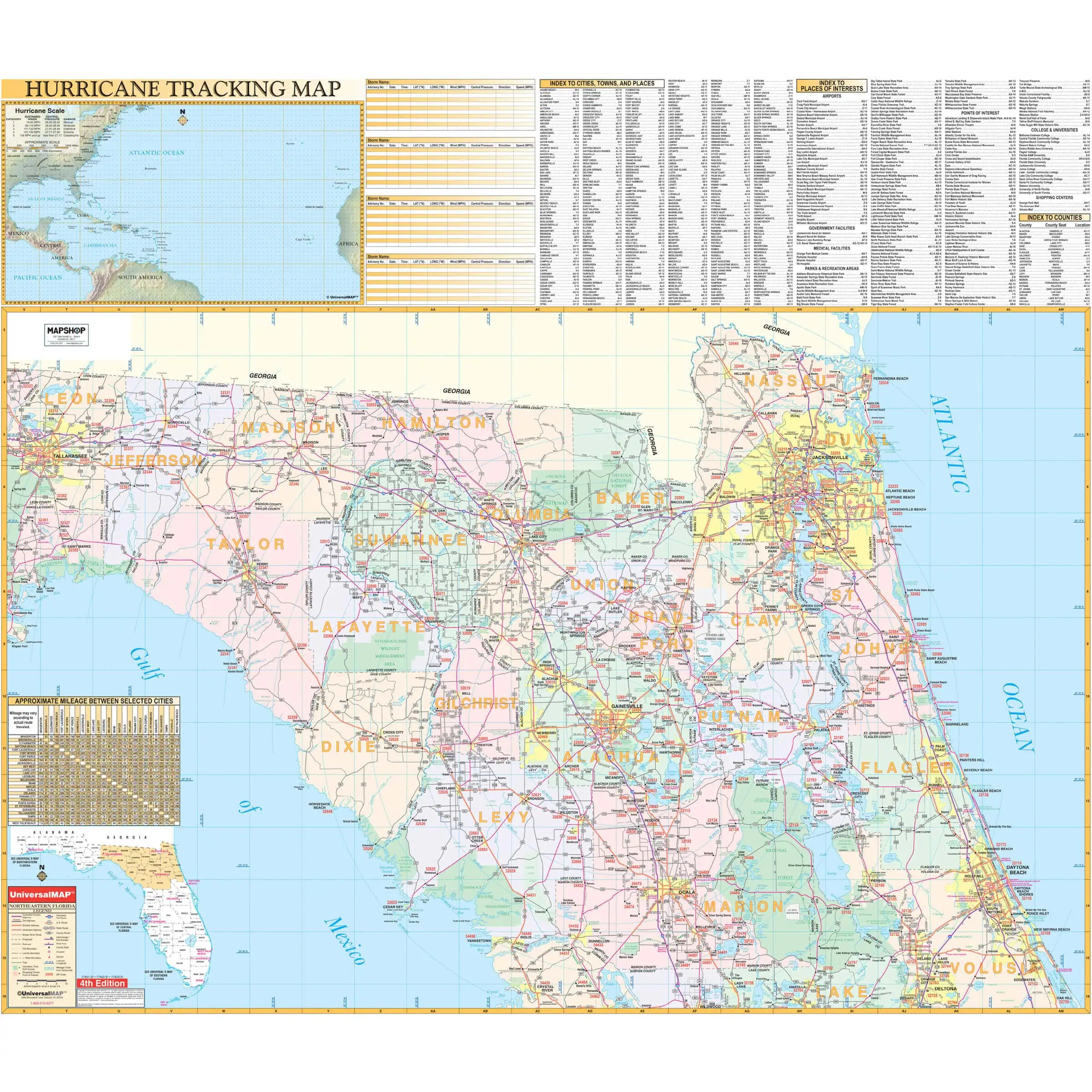 Lakes, rivers, and coastal boundaries are mapped alongside the full road network, giving you a complete geographic picture of the region. A built-in hurricane tracking chart lets you plot storm paths during hurricane season, a critical tool for anyone living or working in coastal Florida.