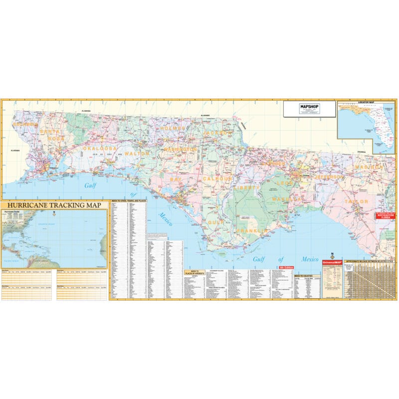 The Northwest Florida Regional Wall Map by Kappa Map Group is a detailed map that covers the northwest region of Florida. It highlights the road networks, including major highways, roads, and notable streets across various counties. Along the left side of the map is a hurricane tracking area with a grid, useful for recording the paths of tropical systems in this hurricane-prone region.
